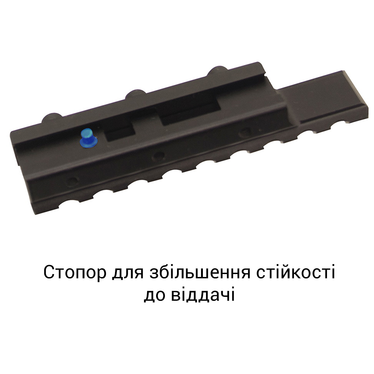 Надійність кріплення забезпечується трьома горизонтальними гвинтами, які міцно фіксують адаптер на напрямній "ластівчин хвіст". Це особливо важливо для потужних пневматичних гвинтівок, де віддача може впливати на точність прицілу. Додатково передбачений стопорний штифт, що значно підвищує стійкість адаптера до динамічних навантажень під час стрільби, мінімізуючи ризик зсуву прицільного обладнання.