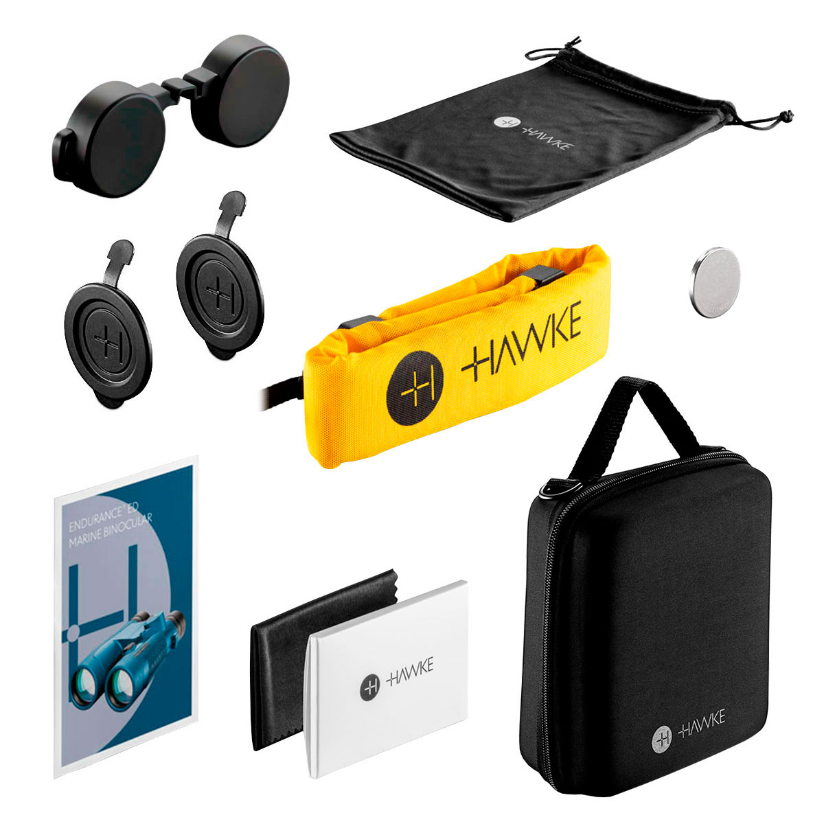 До комплекту бінокля Hawke Endurance ED Marine 7x50 Compass Blue входить яскравий ремінець жовтого кольору, який не тоне у воді, а також захисні кришки на окуляр та об'єктив, напівжорсткий чохол для зберігання і транспортування та мʼякий чохол для зберігання.