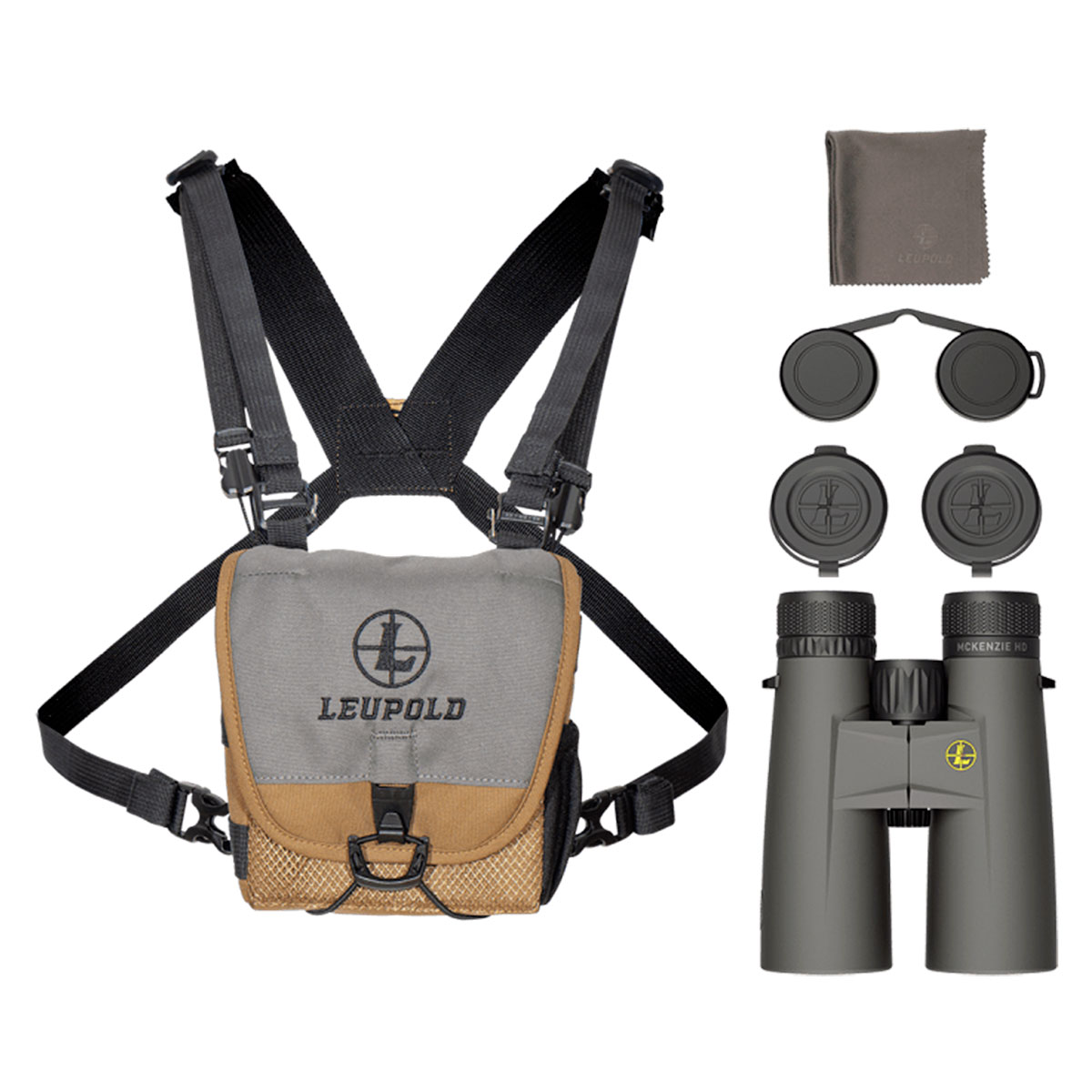 Комплектація бінокля Leupold BX-1 McKenzie HD 10x50 темно-сірий включає захисні кришки для об'єктивів та окулярів, чохол для зберігання і транспортування, серветку для очищення лінз, а також зручну наплічну систему ременів GO Afield™.