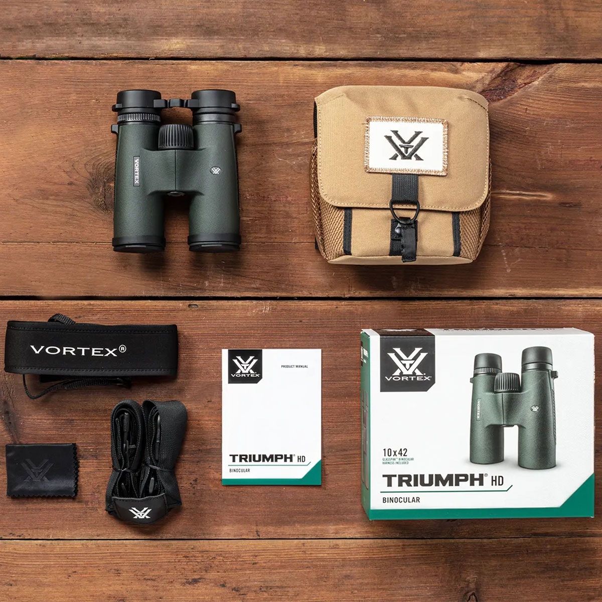 Vortex Triumph HD 10x42 – ергономічний та міцний бінокль, який має оптимальні технічні характеристики та якісні оптичні елементи з HD-скла, завдяки чому спотворення зображення знаходиться на мінімальному рівні, а якість картинки стає більш реалістичною і насиченою. Бінокль має фіксоване оптичне збільшення 10х, об'єктив 42 мм, кутове поле зору 6.4° та широке лінійне поле зору – 111 м на 1 км. Призми побудовані за схемою Roof та виготовлені з високоякісного скла BAK4.