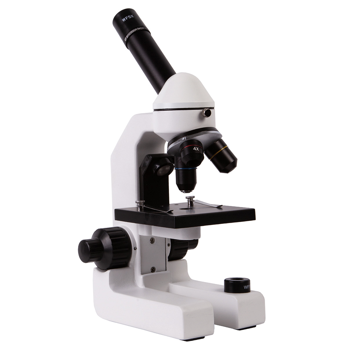 Монокулярна насадка має комфортний для тривалих спостережень кут нахилу в 45º. А завдяки її плавному обертанню на 360º з мікроскопом може працювати група людей, наприклад, під час шкільних уроків. Револьверна головка оснащена трьома стандартними об'єктивами 4x, 10x і 40x. В комплект постачання також входить два окуляра WF 5x та WF 16x, які в комбінації з вищезгаданими об'єктивами дозволяють досягти збільшення від 20х до 640х, а за допомогою комплектної 2-кратної лінзи Барлоу мікроскоп здатний "розігнатися" до 1280х.