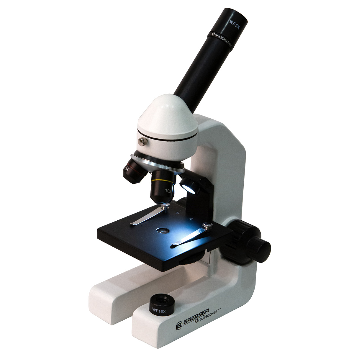 Шкільний мікроскоп Bresser BioDiscover 20х-1280х оснащений подвійною підсвіткою (зверху і знизу) для дослідження препаратів у відбитому та прохідному світлі. Передбачені режими одночасного і роздільного увімкнення. Живлення підсвітки відбувається від побутової електромережі.