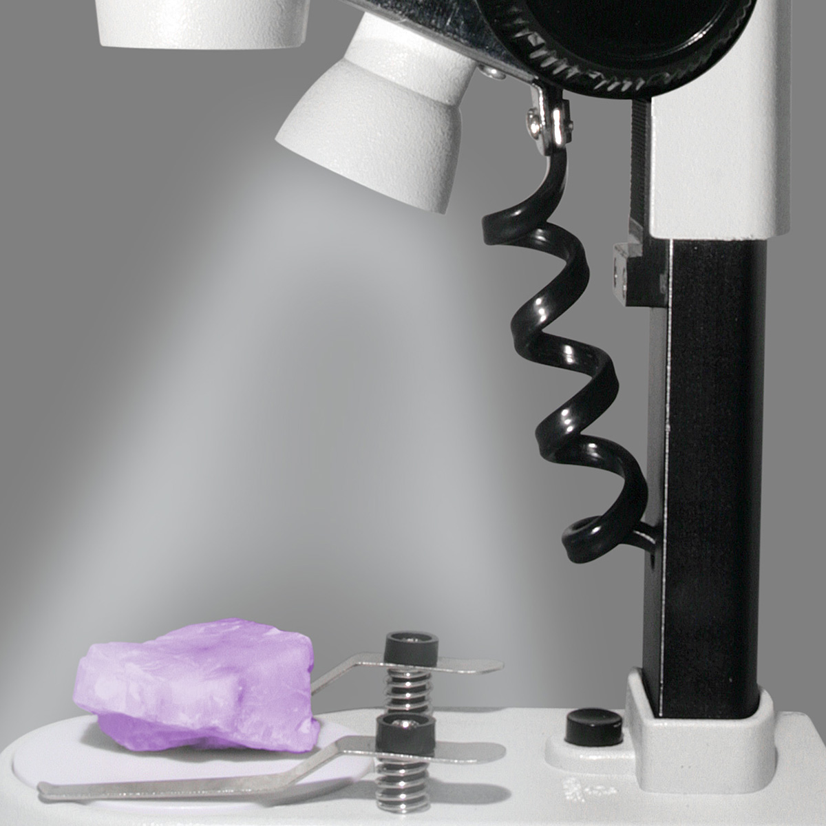 Мікроскоп оснащений верхньою підсвіткою для роботи у відбитому світлі. Підсвітка живиться від двох батарейок типу АА (не входять в комплект), що робить мікроскоп мобільним і незалежним від зовнішніх джерел електроенергії. Зразки розміщуються на предметному двосторонньому диску, який має чорну і білу сторони — це особливо корисно при спостереженні за напівпрозорими, темними або білими об'єктами. Зразки фіксуються за допомогою підпружинених затискачів. Також на основі мікроскопа є кнопка увімкнення/вимкнення підсвітки і зручні опори для рук.