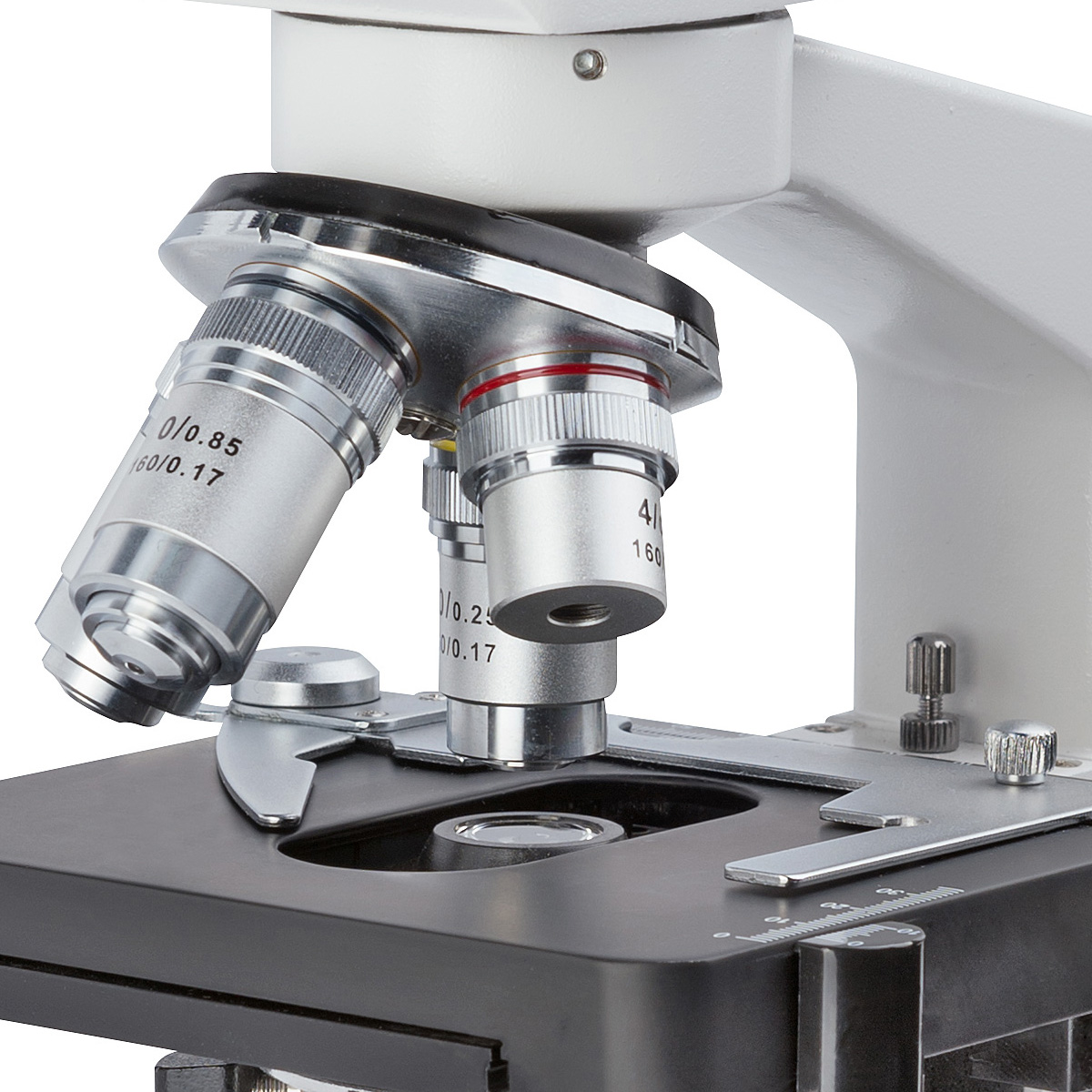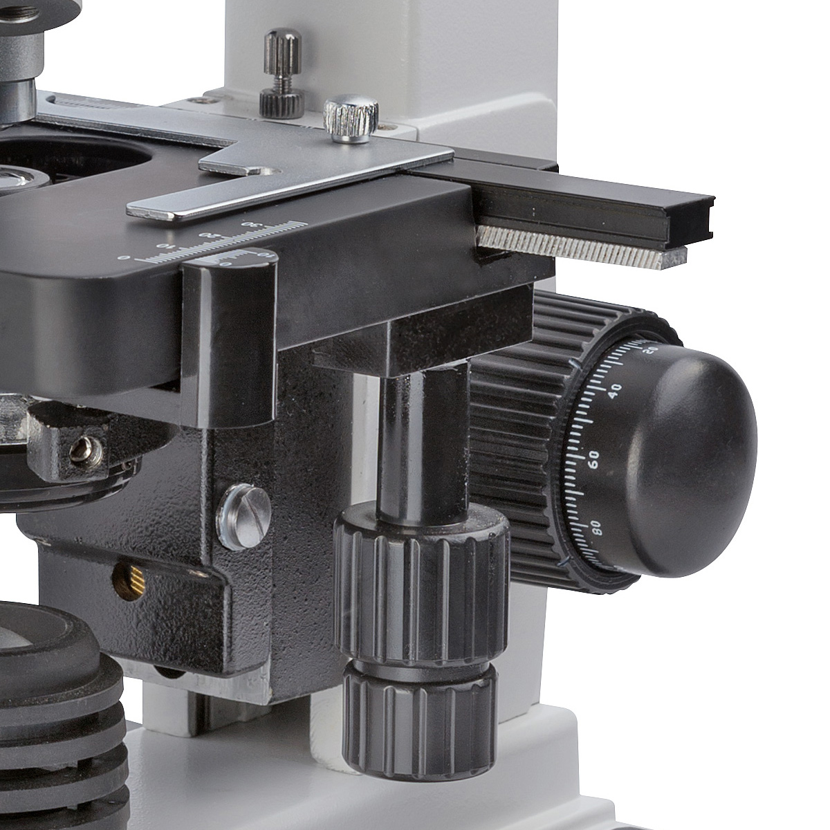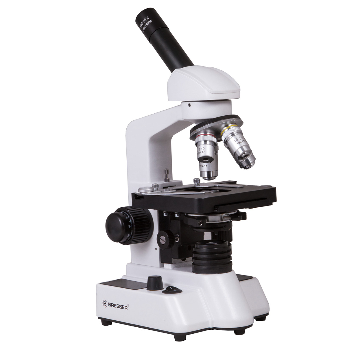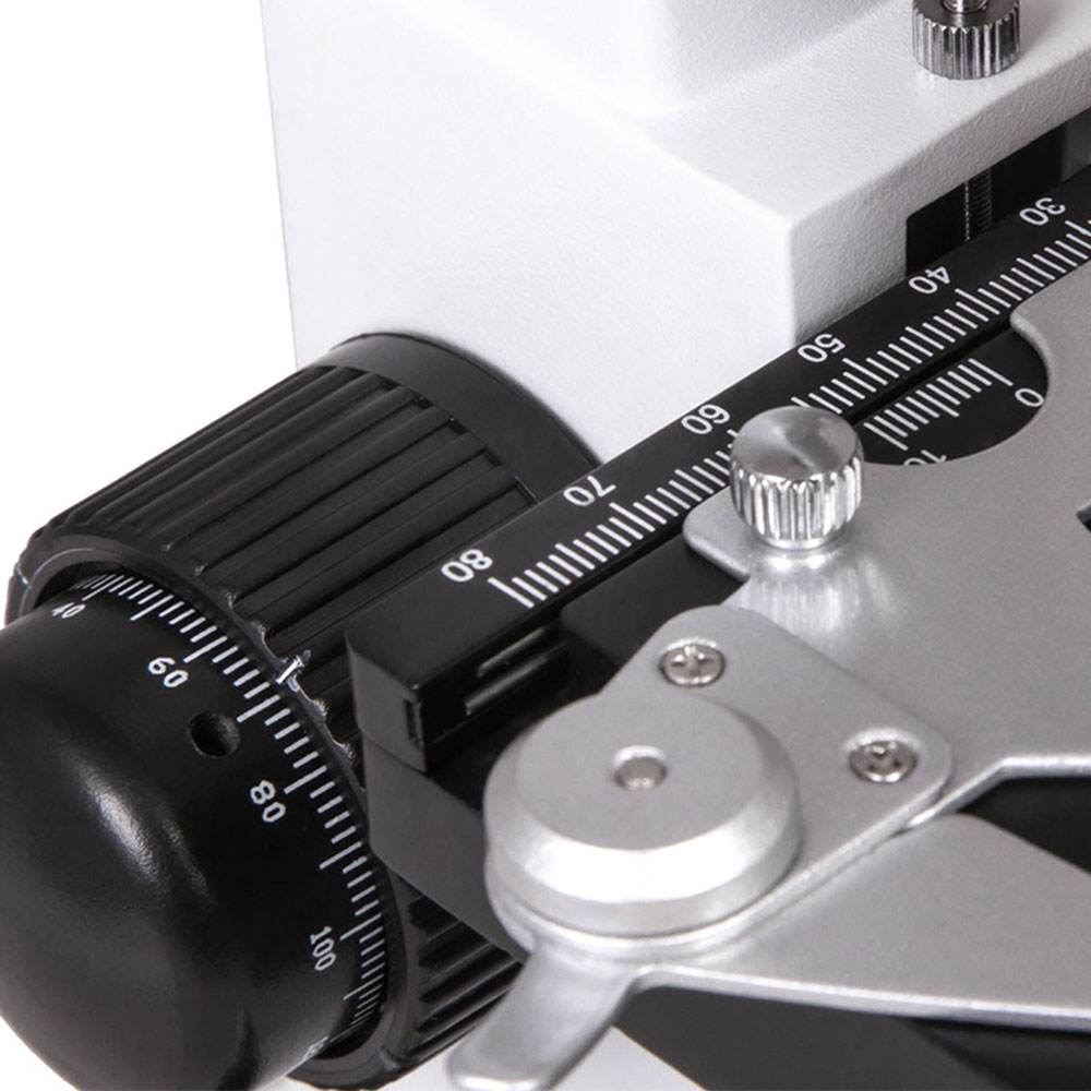 Лабораторний мікроскоп Bresser Erudit DLX 40х-1000х має двосторонні коаксіальні гвинти грубого і точного фокусування. Для акуратного переміщення досліджуваного препарату предметний столик оснащений препаратопереміщувачем.