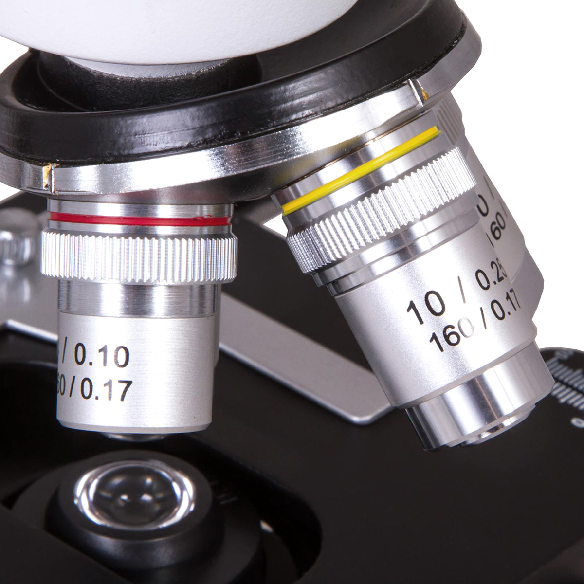 Міцний металевий корпус забезпечує довговічну експлуатацію. Монокулярна насадка обертається на 360°, що дозволяє проводити групові дослідження. Револьверна головка оснащена чотирма об'єктивами 4x, 10x, 40x та 100x, при цьому 100х об'єктив призначений для роботи з імерсійною олією. В комплект постачання також входить ширококутний 10-кратний окуляр, що в комбінації із зазначеними вище об'єктивами забезпечує 40х, 100х, 400х і 1000х збільшення.