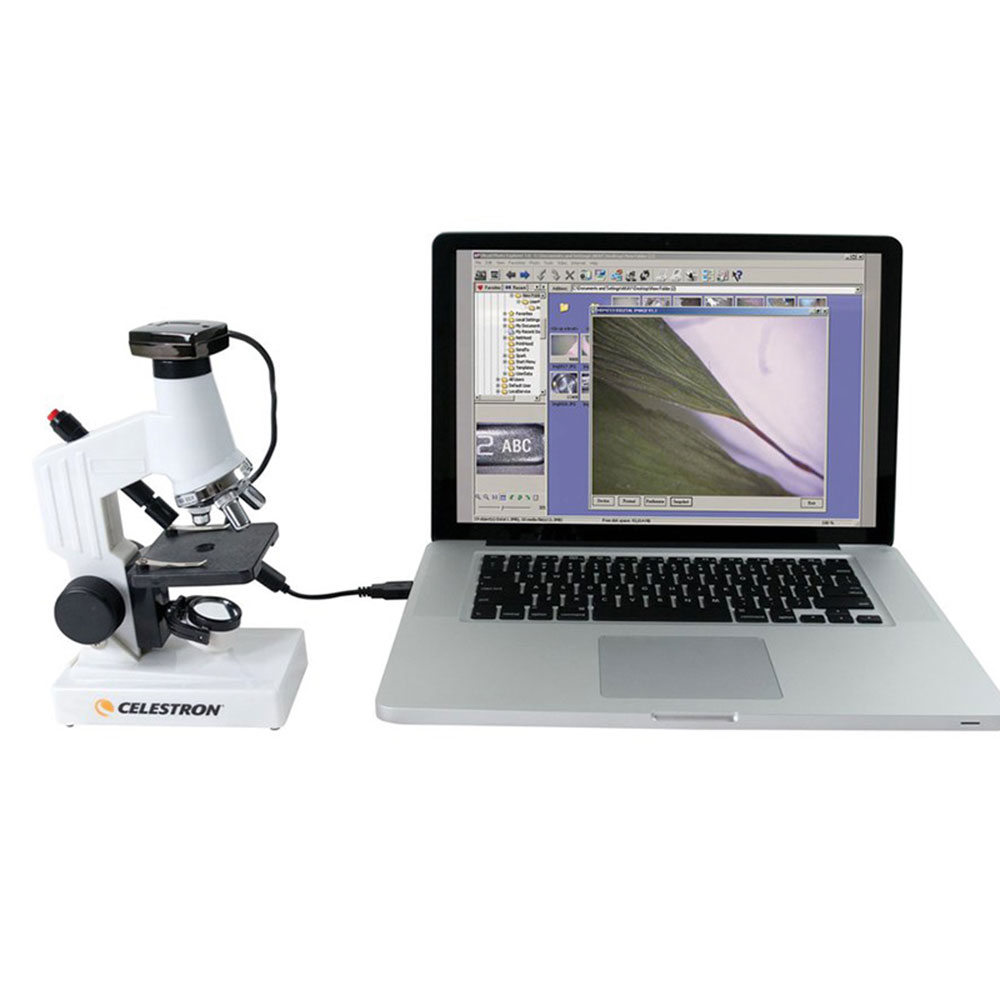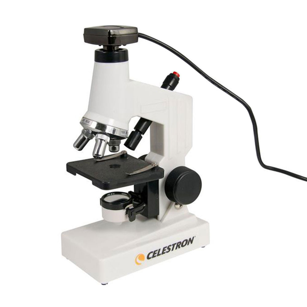 Celestron 40x-600x із цифровою камерою — універсальний біологічний мікроскоп для першого занурення в мікросвіт. Поставляється з цифровою камерою для установки замість окуляра та набором для дослідів, у складі якого є три готових зразка для спостереження: