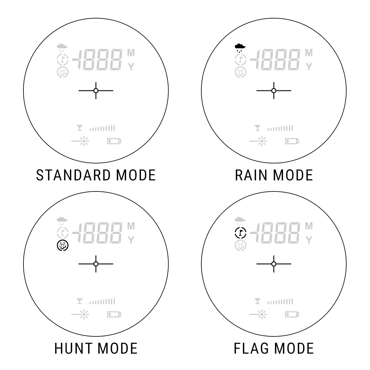 - RAIN MODE — вимірює відстань до цілі по прямій лінії, ігноруючи будь-які перешкоди від падаючих крапель дощу.