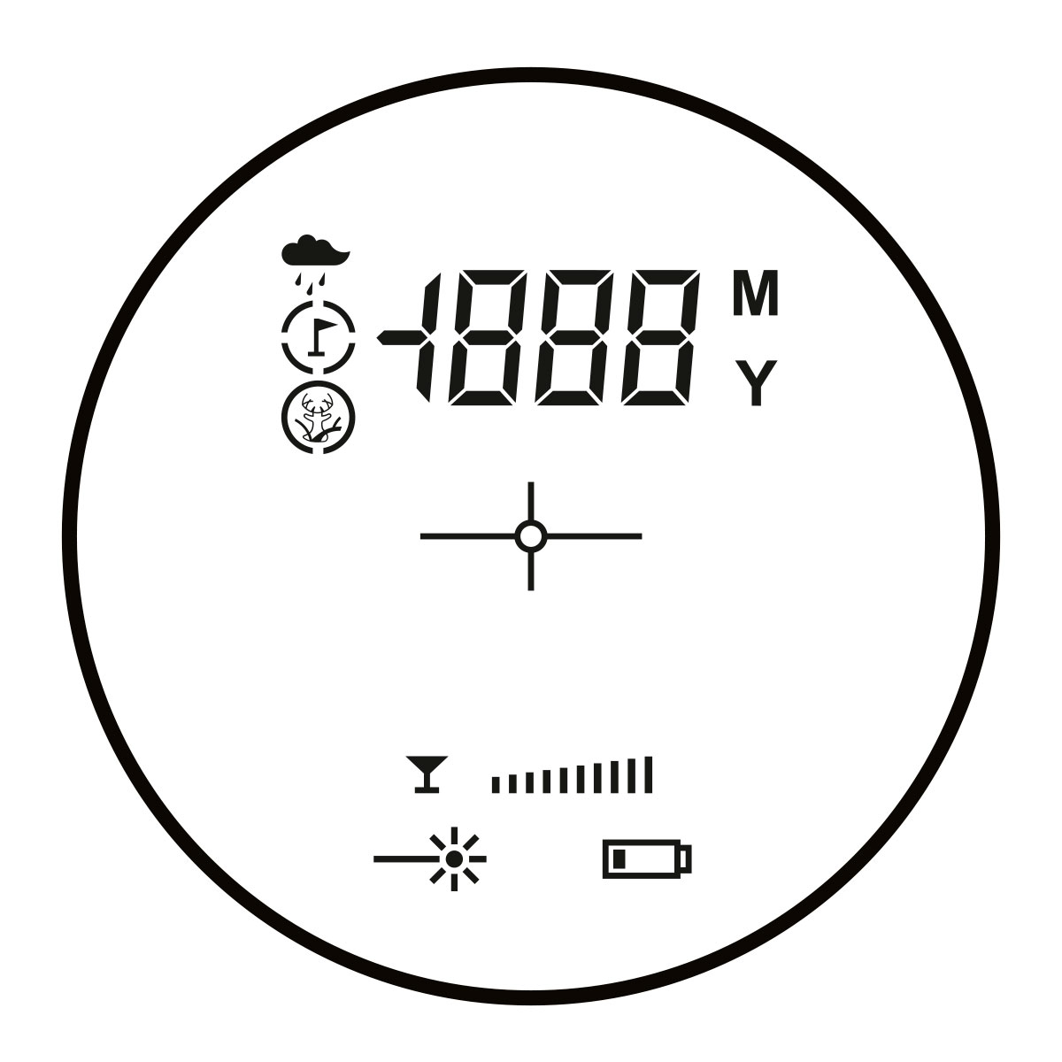 - RAIN MODE — вимірює відстань до цілі по прямій лінії, ігноруючи будь-які перешкоди від падаючих крапель дощу.