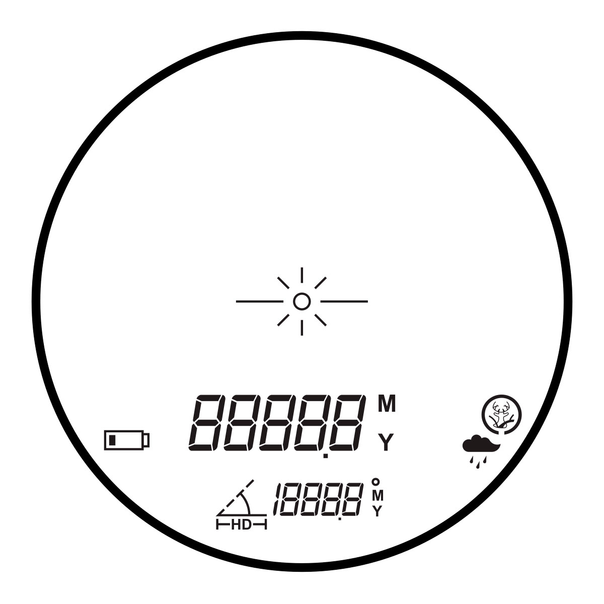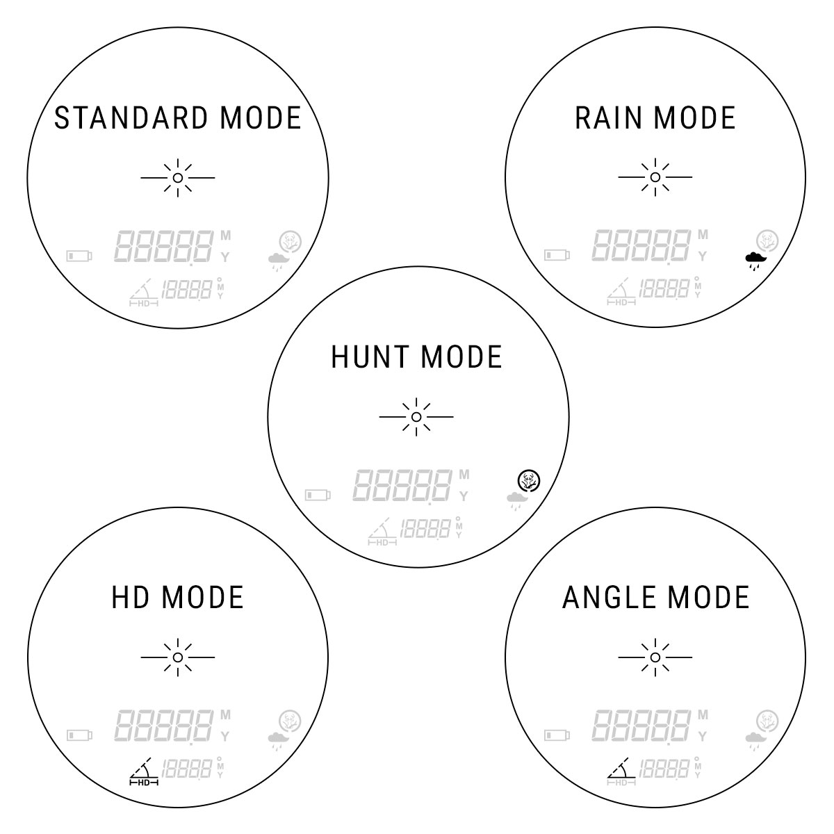 - RAIN MODE — вимірює відстань до цілі по прямій лінії, ігноруючи будь-які перешкоди від падаючих крапель дощу.