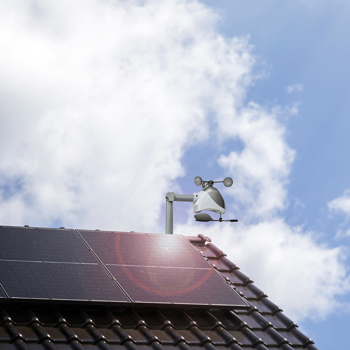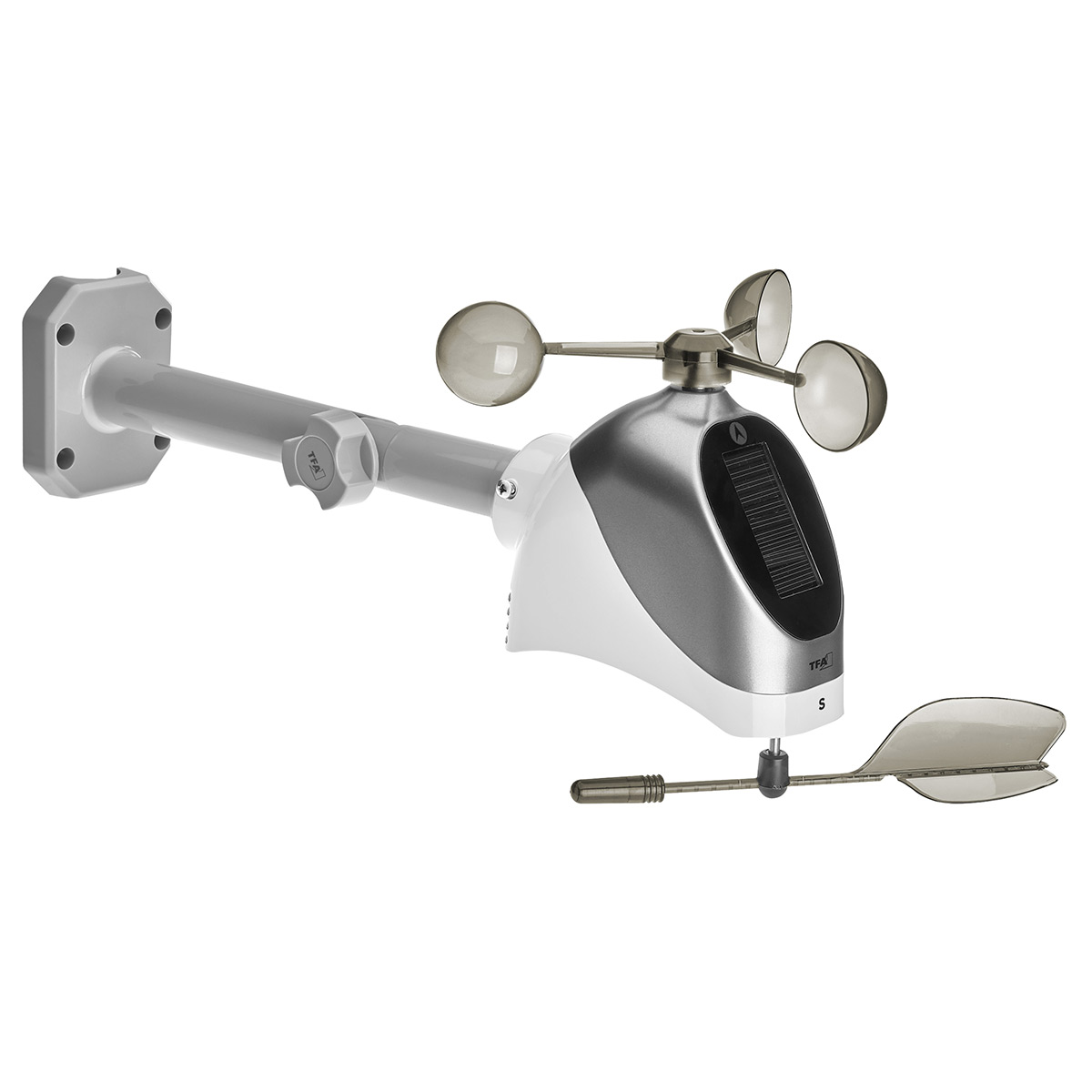 Датчик з високою точністю вимірює температуру, вологість, швидкість вітру та визначає його напрямок. Дані відображаються на дисплеї метеостанції та/або доступні в додатку TFA VIEW. Передача даних здійснюється на частоті 868 МГц та на відстані до 100 метрів прямої видимості. Живиться датчик від вбудованої сонячної батареї або батарейок АА.