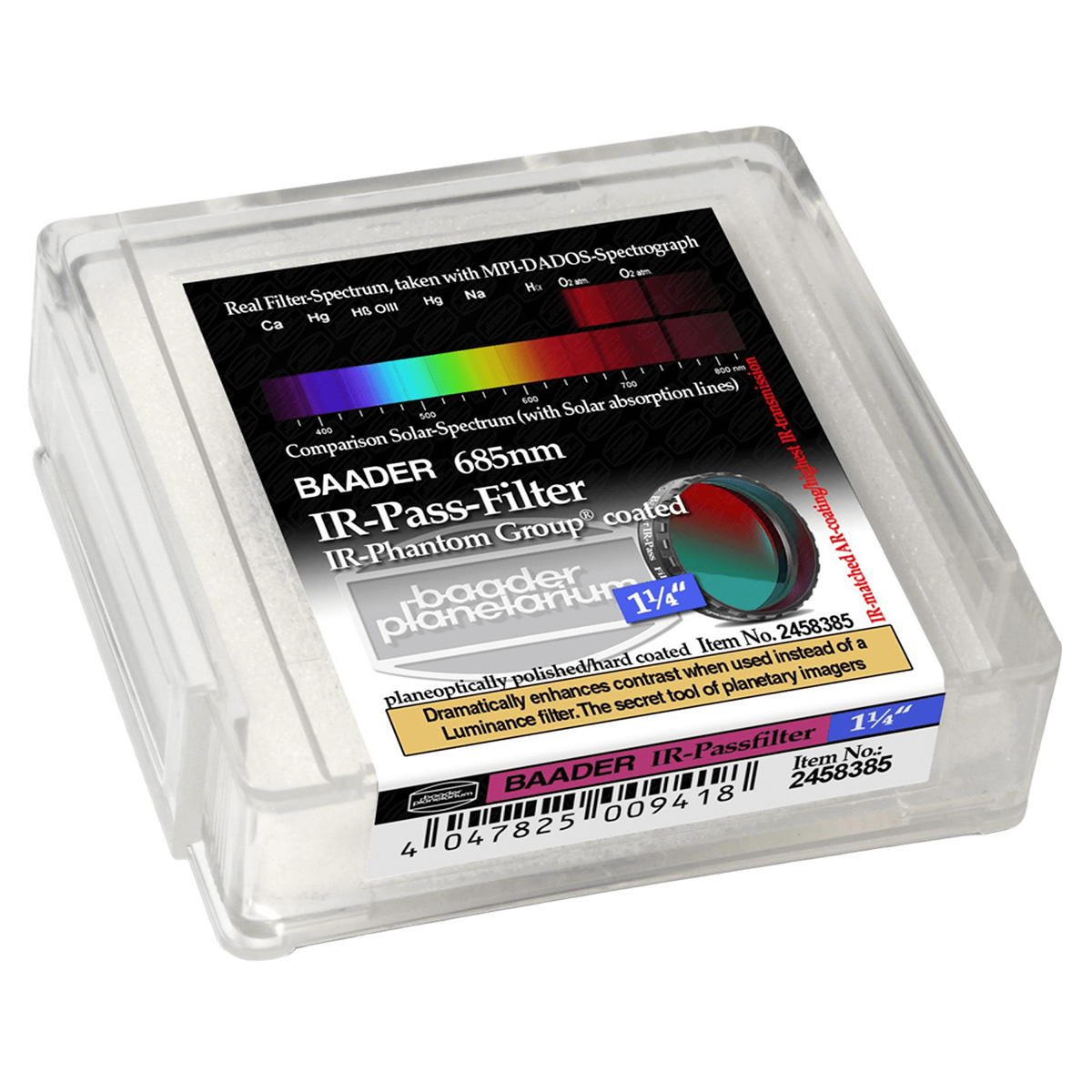 Фільтр Baader Planetarium IR Pass 1.25" пропускає інфрачервоне випромінювання та блокує майже весь видимий спектр. Смуга пропускання починається приблизно з 685 нм – у глибокій червоній ділянці спектра. Завдяки роботі в інфрачервоному діапазоні значно зменшується вплив атмосферної турбулентності, що дозволяє отримати більш різке та контрастне зображення. Темні структури на Марсі, Юпітері, Місяці та Сонці передаються чіткіше й стабільніше.