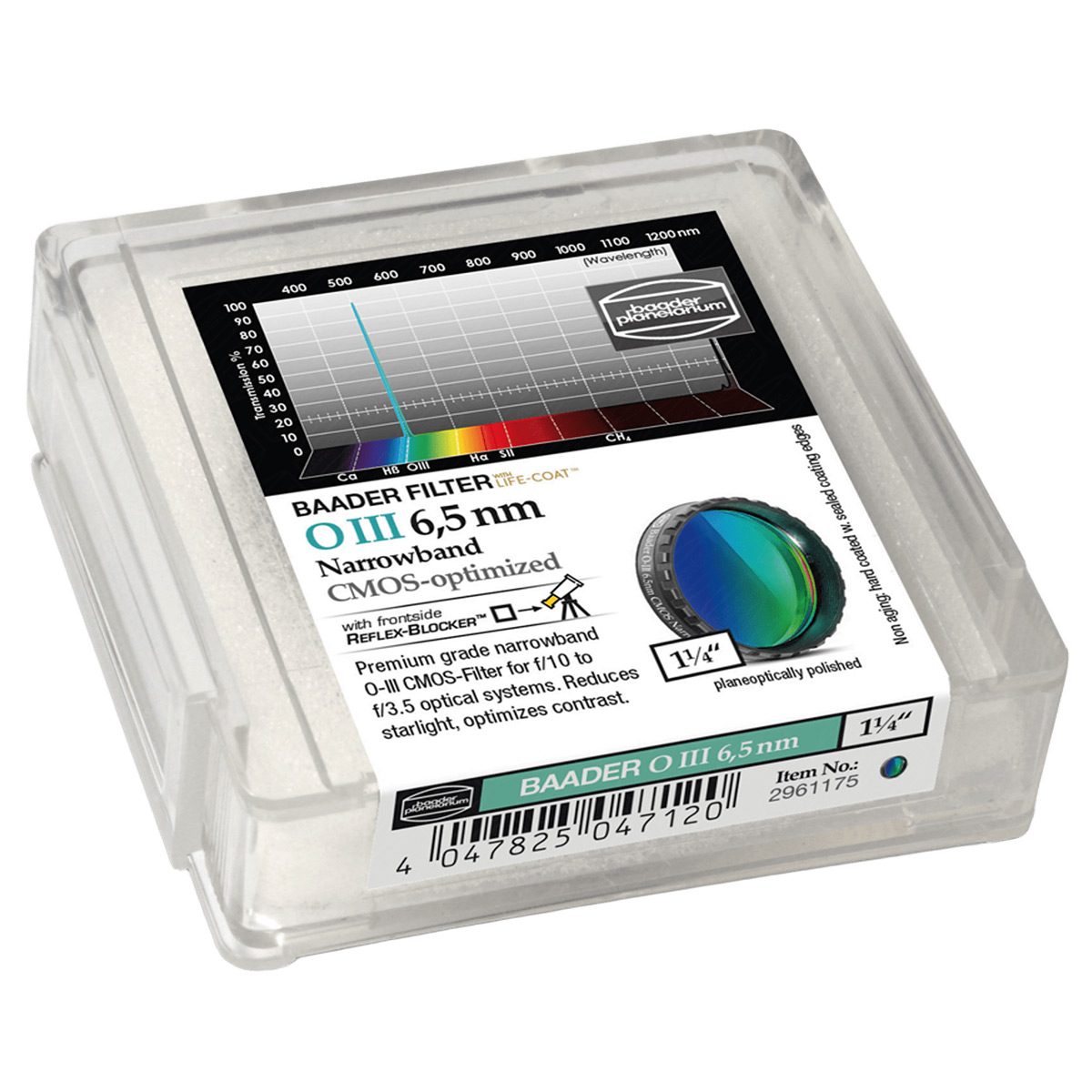 Фільтр Baader Planetarium О-ІІІ (6.5 нм) CMOS 1.25" – вузькосмуговий фільтр прецизійного класу для астрофотографії. Пропускає тільки частину спектра навколо лінії O-III, підвищуючи контраст між небом і об’єктами глибокого космосу, наприклад планетарними або дифузними туманностями. Центр смуги пропускання – 500.7 нм, а її ширина складає 6.5 нм. Рекомендується до використання з оптичними системами від f/3.5.