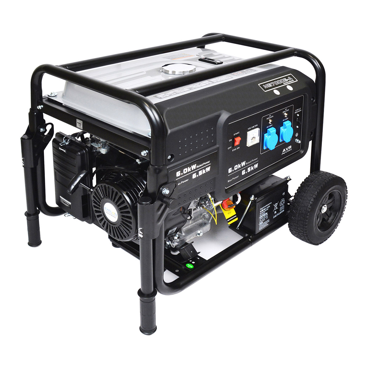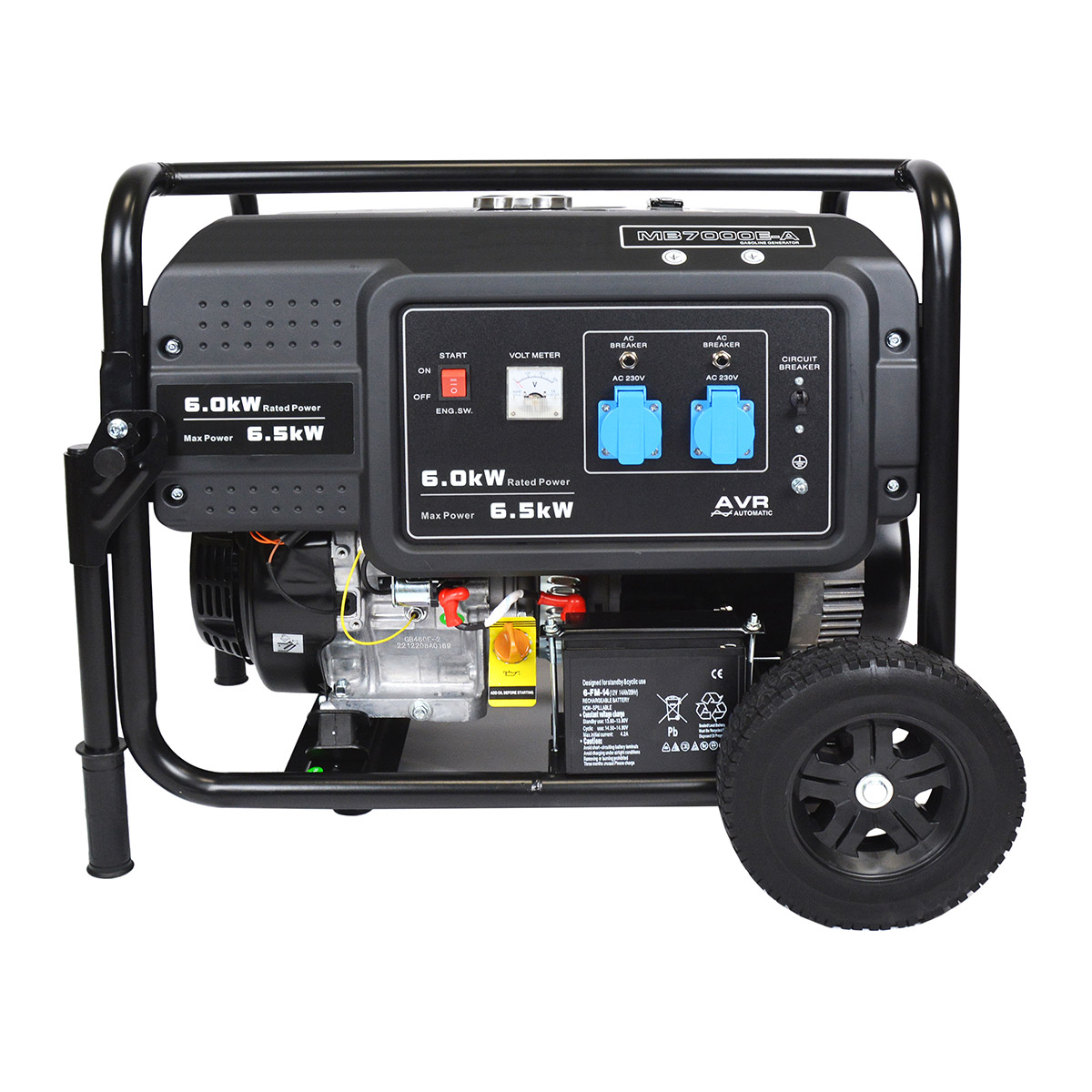 MB7000E-A (6 - 6.5 кВт) – це однофазний бензиновий генератор змінного струму з електростартером, системою стабілізації напруги (AVR) та мідною обмоткою альтернатора. Призначений для застосування у якості резервного джерела живлення з номінальною вихідною потужністю електромережі у 6 кВт та максимальною - 6.5 кВт. Безперервна робота на одному паливному баку при 50% навантаження досягає 16.8 годин.