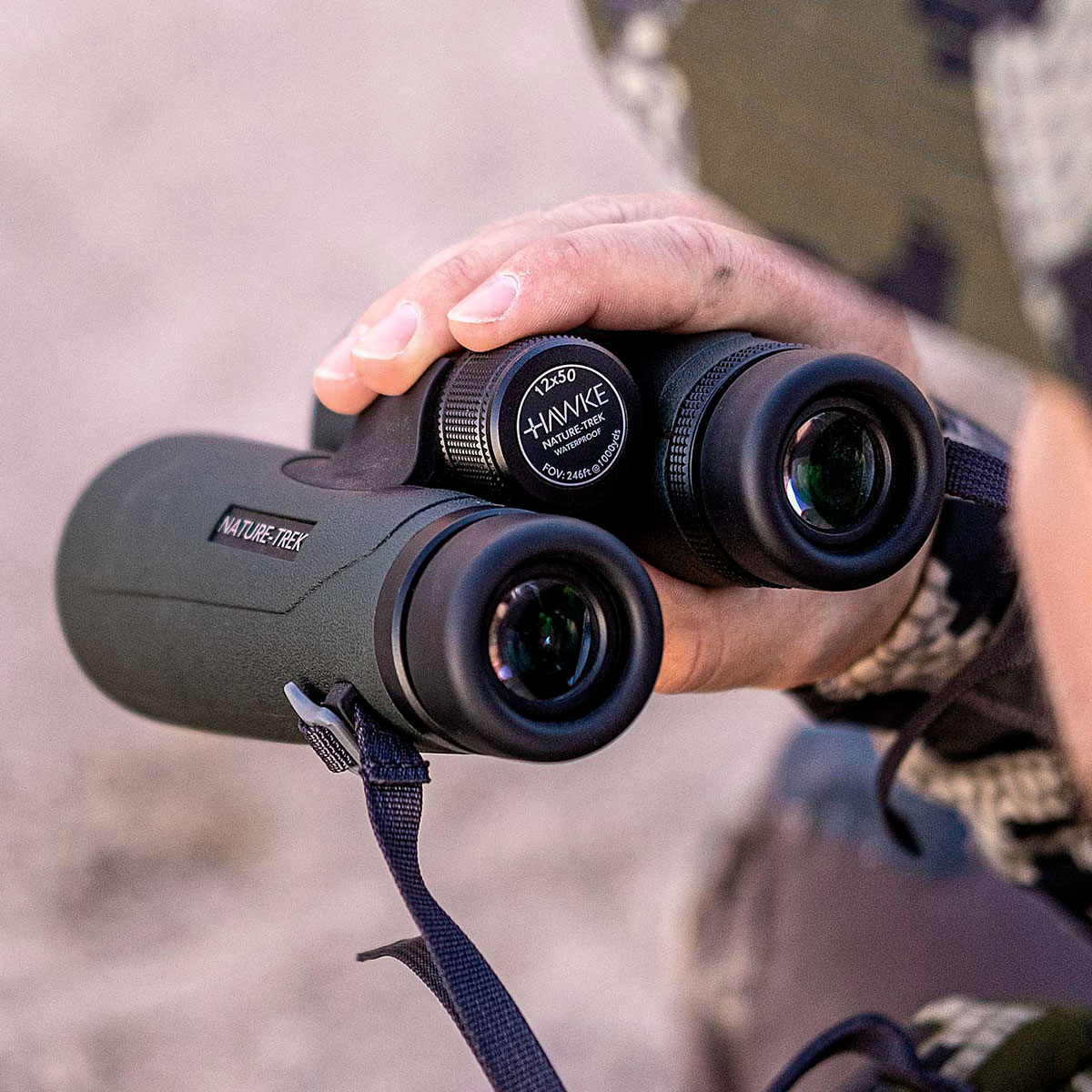 Hawke Nature Trek 12x50 Top Hinge (Green) – багатофункціональний бінокль з якісною оптикою Hawke H2, широким полем зору (82 м на 1 км), оптичним збільшенням 12x, великим 50-міліметровим об'єктивом та сучасною конструкцією петлі "Верхній міст", яка забезпечує зручний захват та дає перевагу у вазі в порівнянні з класичною конструкцією шарніра.