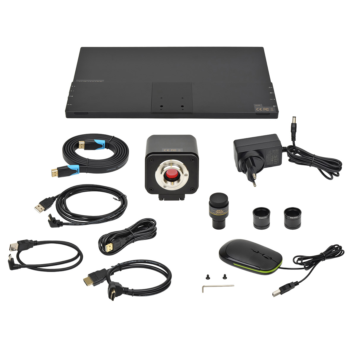 Камера має компактний металевий корпус з повноцінною панеллю керування та різьбою C-Mount для універсальної сумісності з мікроскопами. У комплект входить оптичний блок FMA050 для підключення до стандартних окулярних трубок 23.2 мм.