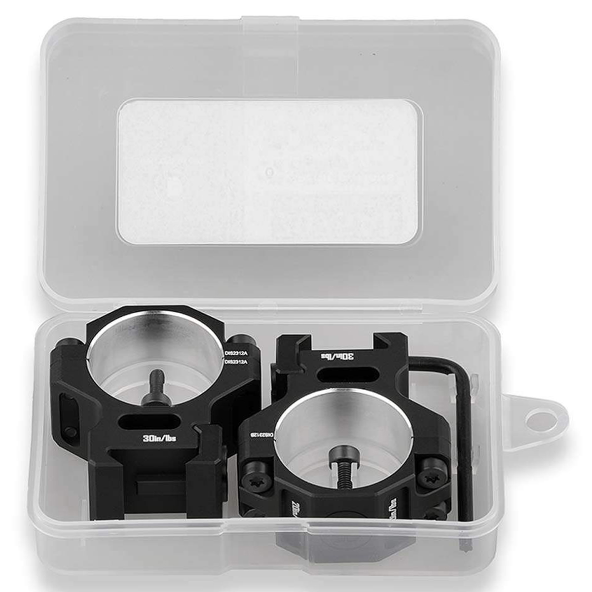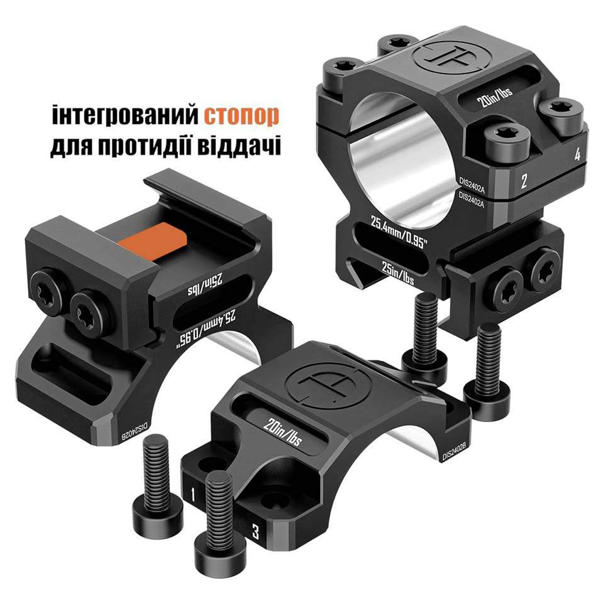 Для підвищеної надійності конструкція оснащена посиленими гвинтами формату T-20 Torx, які гарантують рівномірний розподіл навантаження та запобігають деформації корпусу при затягуванні. Додатковий стопор віддачі забезпечує фіксацію без зміщень навіть під час використання на зброї з високою віддачею. Загальна вага комплекту становить 140 г, що робить ці кільця оптимальним вибором для тих, хто прагне зберегти баланс та легкість зброї без втрати надійності.