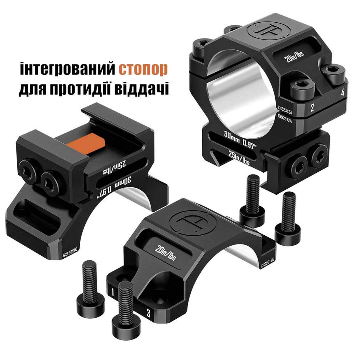 Надійність фіксації забезпечується шляхом використання посилених гвинтів формату T-20 Torx, які дозволяють рівномірно розподіляти навантаження та надійно утримувати приціл у стабільному положенні. Для додаткового захисту від зміщення під час стрільби, особливо на зброї з сильною віддачею, конструкція має інтегрований стопор. Вага комплекту становить 144 г — це оптимальний показник для збереження загального балансу зброї, не перевантажуючи її та не впливаючи на керованість.