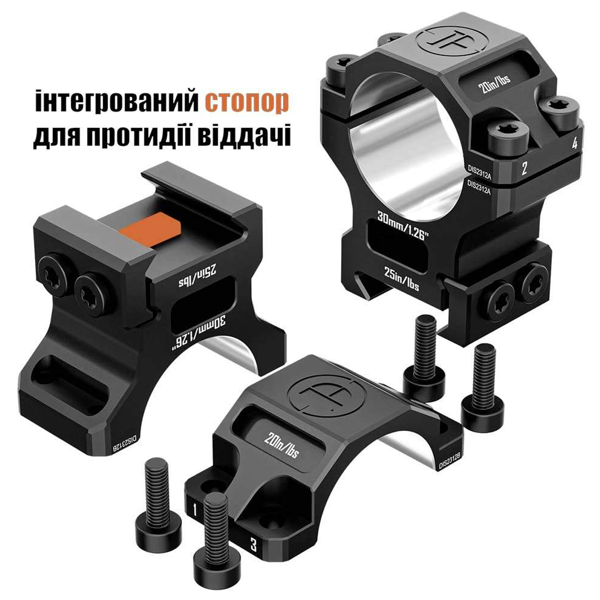 Надійність фіксації забезпечується шляхом використання посилених гвинтів формату T-20 Torx, які дозволяють рівномірно розподіляти навантаження та надійно утримувати приціл у стабільному положенні. Для додаткового захисту від зміщення під час стрільби, особливо на зброї з сильною віддачею, конструкція має інтегрований стопор. Вага комплекту становить 155 г — це оптимальний показник для збереження загального балансу зброї, не перевантажуючи її та не впливаючи на керованість.