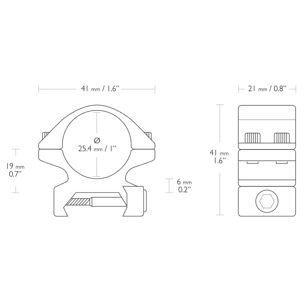 Кільця мають низький профіль з висотою основи 6 мм, що дозволяє встановлювати приціл якомога ближче до ствола, зменшуючи паралакс і покращуючи ергономіку прицілювання. Висота до оптичної осі становить 19 мм, роблячи ці кільця оптимальними для більшості класичних конфігурацій прицілів і прикладів зброї. Внутрішні захисні вставки зберігають цілісність корпусу прицілу, запобігаючи подряпинам і зсувам під час монтажу або стрільби.