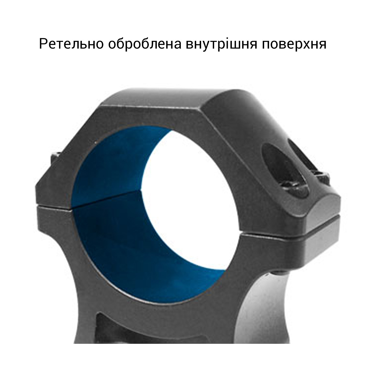 Корпус виробу виготовлено з міцного авіаційного алюмінію марки 6061-T6, який поєднує легкість із підвищеною жорсткістю та витривалістю. Матове чорне анодування не лише гарантує ефективний захист від корозії, а й знижує відблиски, що може бути важливо при стрільбі в польових умовах. Внутрішня поверхня кілець ретельно оброблена для кращого зчеплення з трубкою прицілу, запобігаючи її провертанню або пошкодженню.