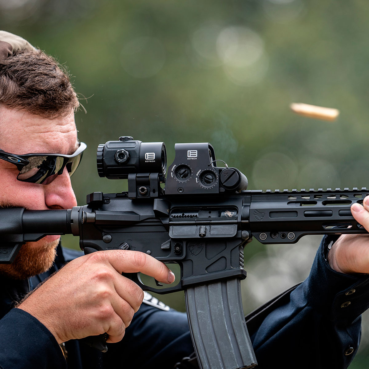 EOTECH HWS EXPS3-0 – коліматорний приціл з голографічною проєкцією, який чудово підійде для стрільби по цілях, що рухаються. Головна особливість – марка завжди проєктується у точку погляду стрілка. Це дозволяє працювати в умовах забруднення скла або навіть його часткового пошкодження, адже точка переміщається за точкою фокусування ока.