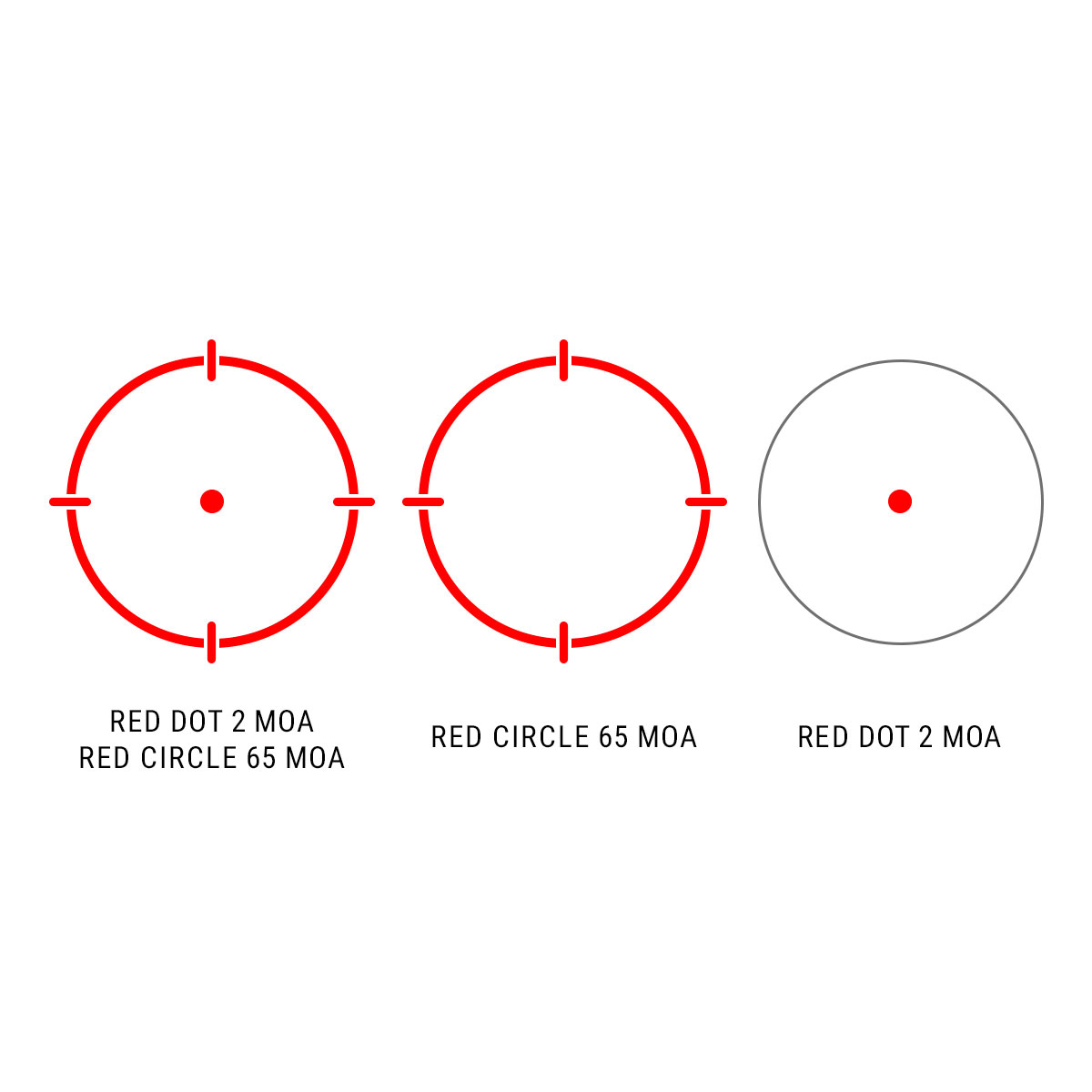- Прицільна сітка: точка 2 МОА; коло 65 МОА; точка 2 МОА у колі 65 МОА
