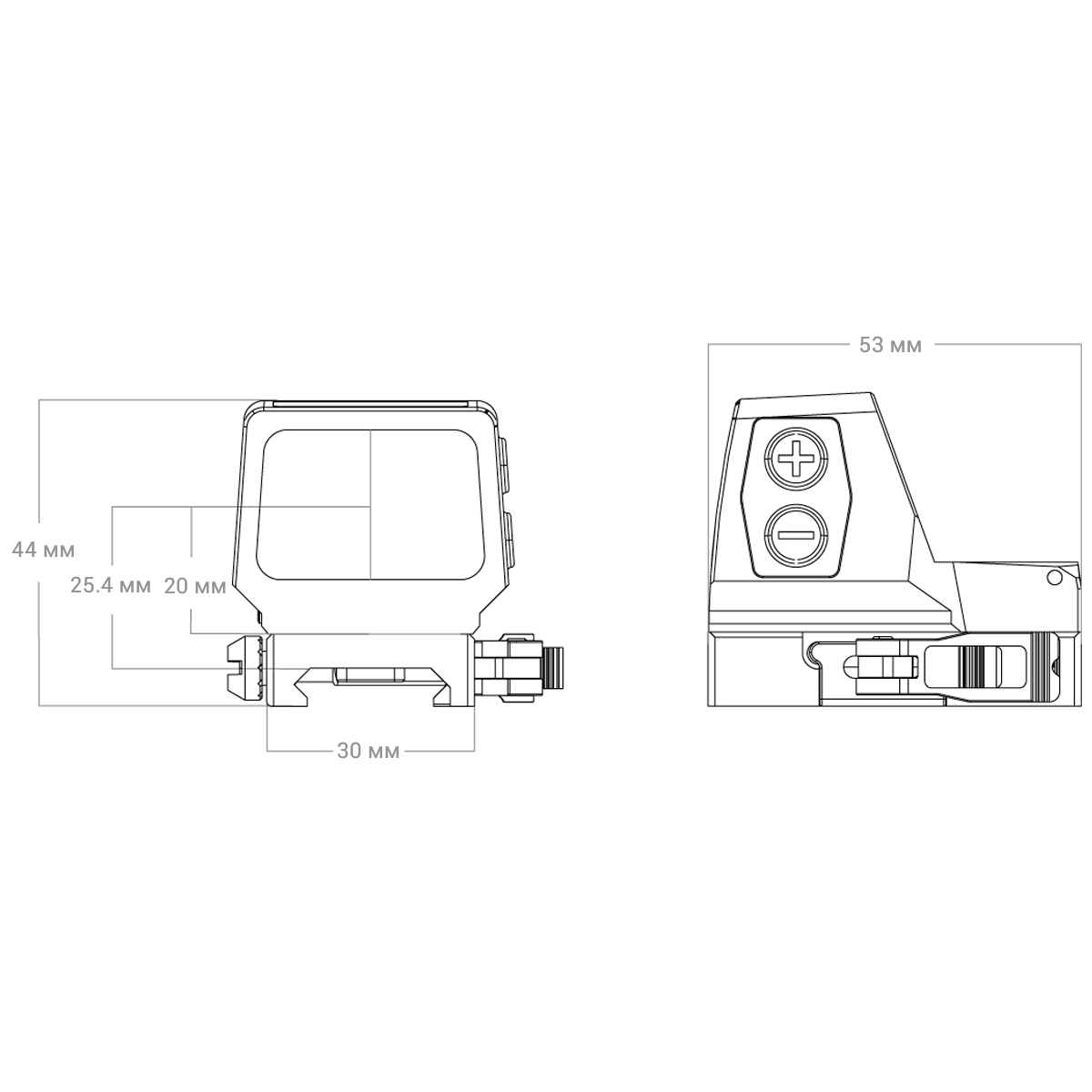 - Розміри прицілу (Д x В): 53 x 44 мм (з кріпленням)