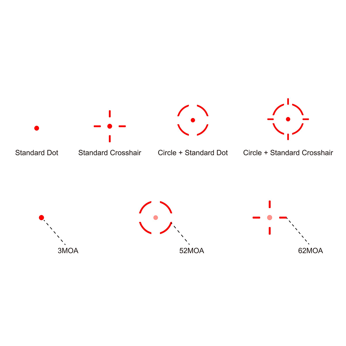 - Розміри прицільної сітки: точка 3 MOA, точка 3 MOA + коло 52 MOA, точка 3 MOA + перехрестя 62 MOA, точка 3 MOA + перехрестя в колі 62 MOA