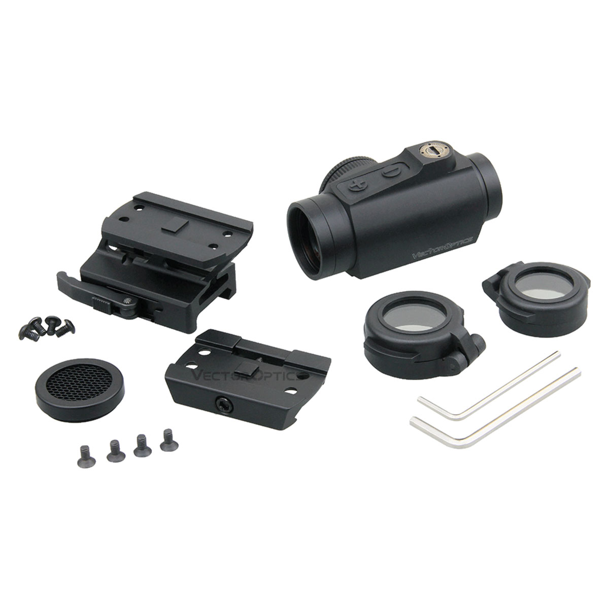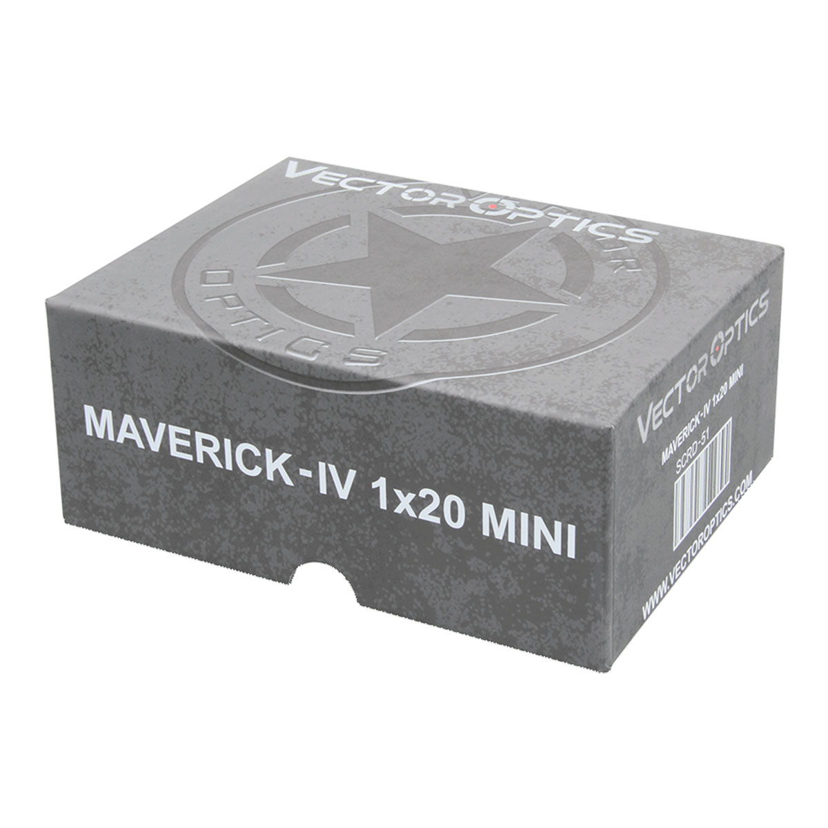 Комплектація Vector Optics Maverick-IV 1x20 Mini Red Dot включає 2 види кріплень – високе швидкознімне Quick Detach та низьке звичайне, які призначені для встановлення на планку Weaver/Picatinny. Також до комплекту входять відкидні захисні кришки для окуляра та об'єктива, сонцезахисна бленда, набір гвинтів, а також шестигранні ключі (2 шт.).