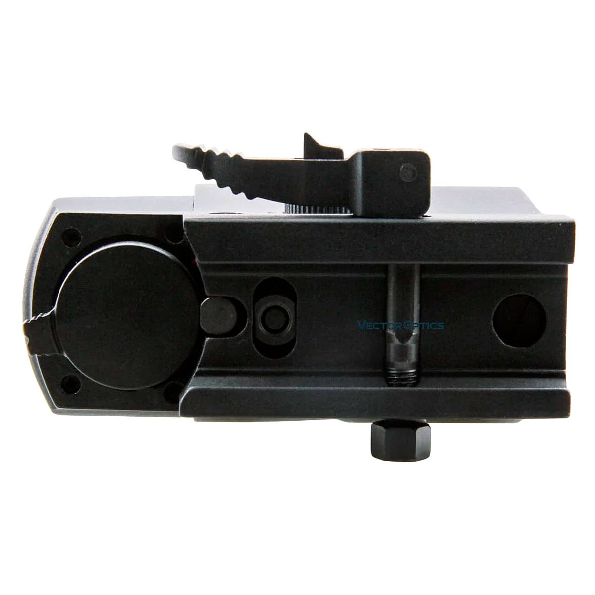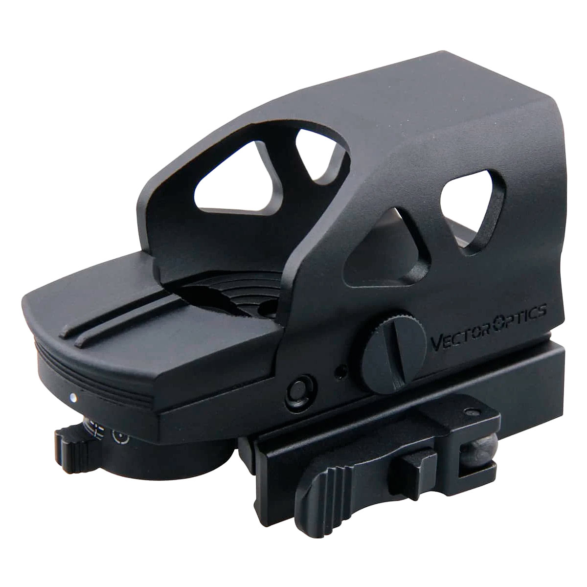 Коліматорний приціл Vector Optics Ratchet 1x23x34 має ударостійкий корпус з матовим покриттям чорного кольору. Його лінза надійно закрита металевою оправою з виступами з боків та зверху, що захищає її від зовнішніх впливів. Кріплення прицілу на 21-міліметрову планку Weaver/Picatinny здійснюється за допомогою швидкознімного затискача Quick Detach.