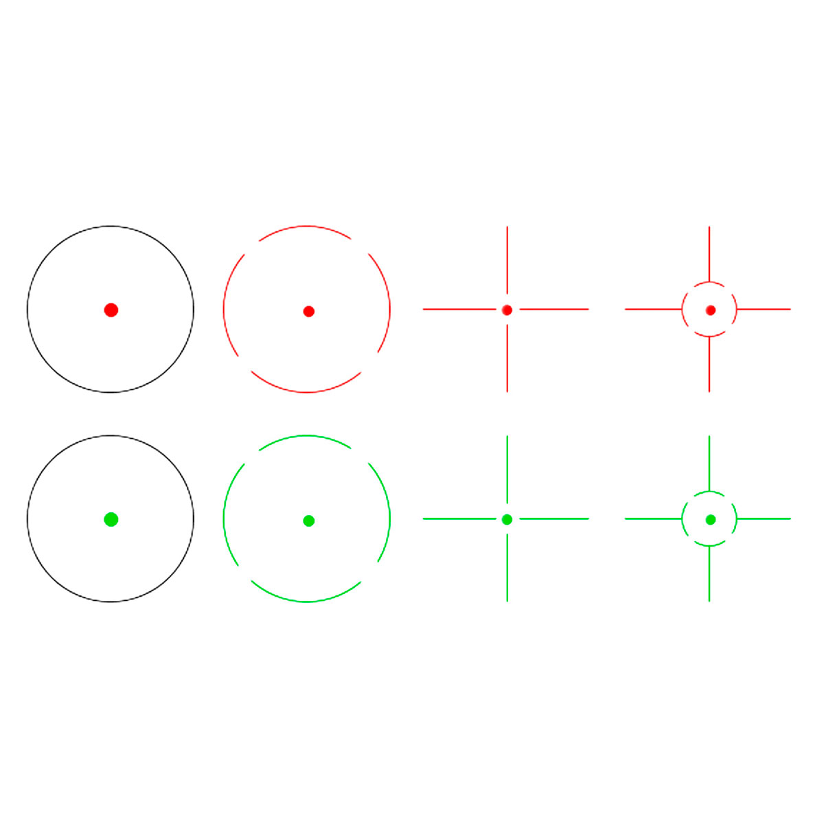 Користувачам надається вибір з наступних прицільних сіток: точка, точка в перехресті, точка в колі, точка з перехрестям у колі. Усі ці сітки можуть підсвічуватися червоним або зеленим кольором з 6 рівнями яскравості, завдяки чому інтенсивність світіння можна адаптувати під будь-який час дня і ночі.