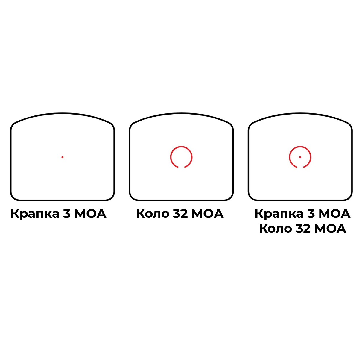 - Прицільна сітка: точка 3 МОА; коло 32 МОА; точка 3 МОА у колі 32 МОА