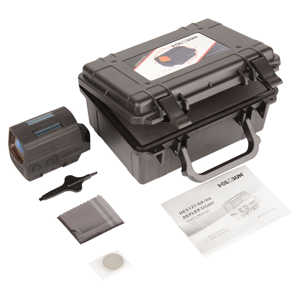 Коліматор Holosun HE512T-GR має комфортну Super LED підсвітку зеленого кольору та Multiple Reticle System™ (M.R.S.), пропонуючи користувачеві 3 варіанти прицільних сіток: точка 2 МОА; коло 65 МОА; точка 2 МОА у колі 65 МОА. Яскравість підсвітки можна регулювати вручну, вибравши один з 12 режимів, або в автоматичному режимі приціл сам підбере яскравість залежно від рівня зовнішнього освітлення. Корпус прицілу повністю герметичний, газонаповнений та має захист за стандартом IP67. Кріпиться на планку Weaver/Picatinny за допомогою низького інтегрованого кріплення. Постачається в дуже зручному та добре захищеному пластиковому кейсі з ручкою.