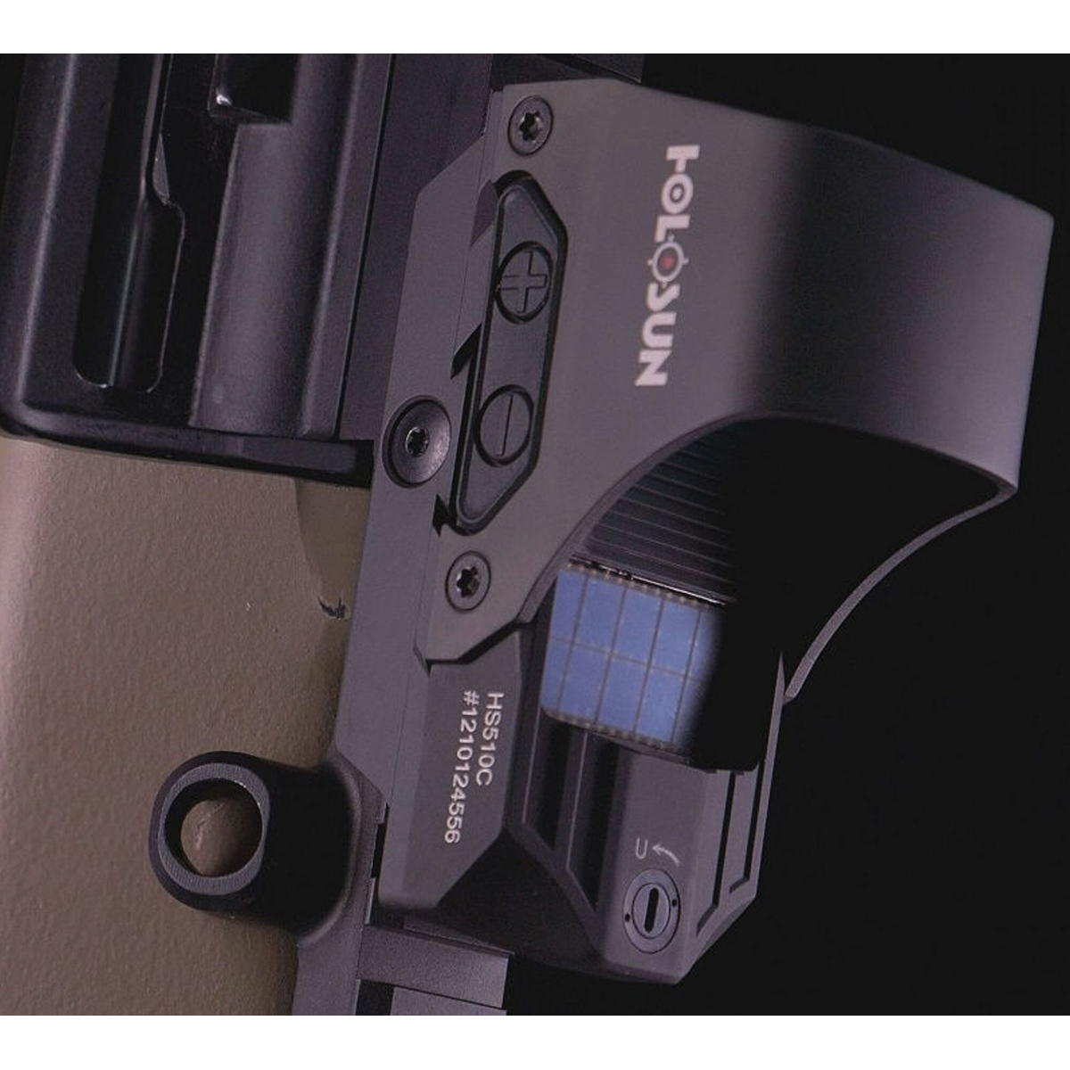Основний корпус виготовлено з міцного алюмінієвого сплаву T6061-T6, а захисний кожух із легованого титану, який надійно оберігає лінзу від ударів. Holosun оснастив модель зручним швидкознімним кріпленням (QD) на планку Weaver/Picatinny, гарантуючи повернення до «нуля» при повторному встановленні. Притискне зусилля на планку Вівер легко регулюється комплектним ключем. Сам прилад відкритий, що сприяє кращому огляду механічних прицільних пристосувань. HS510C має діапазон поправок у 50 MOA по вертикалі та горизонталі з ціною кліка 1/2 MOA.
