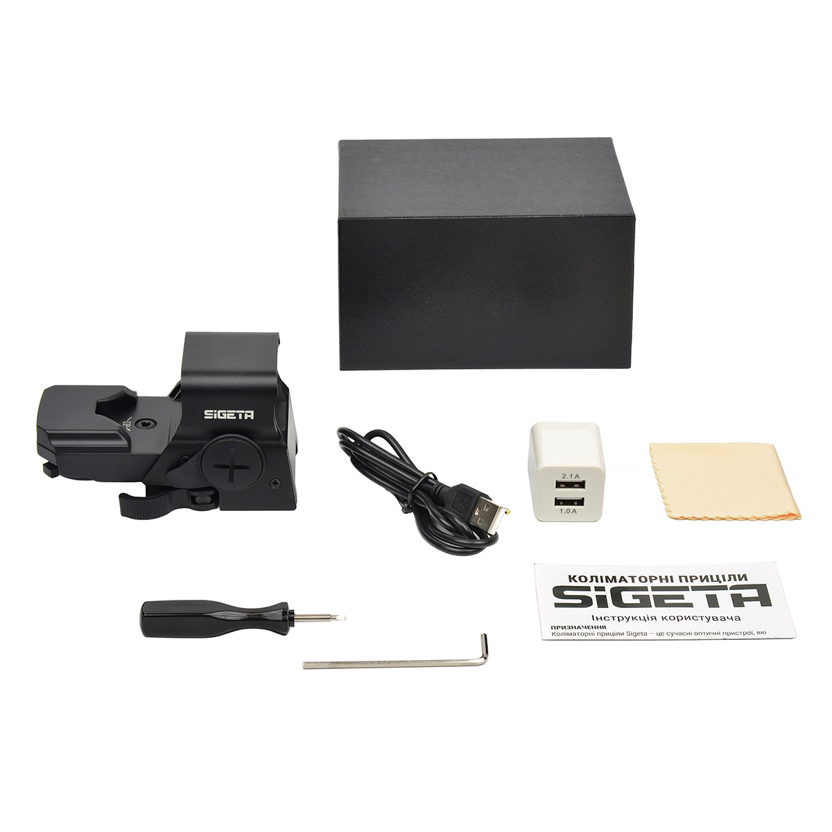 SIGETA AntiRU-02 — високотехнологічний коліматорний приціл відкритого типу в модельному ряді Sigeta. Він надає користувачеві великий ступінь свободи від елементів живлення шляхом використання акумулятора (CR2032 Rechargable) з можливістю зарядки прямо в корпусі коліматора по USB від мережі через блок живлення (є в комплекті) або від PowerBank.