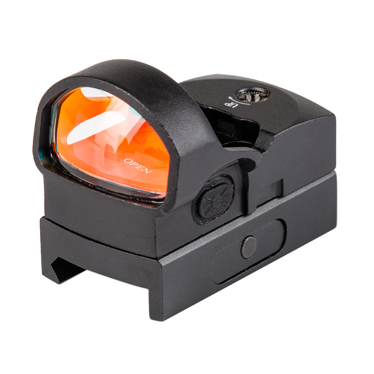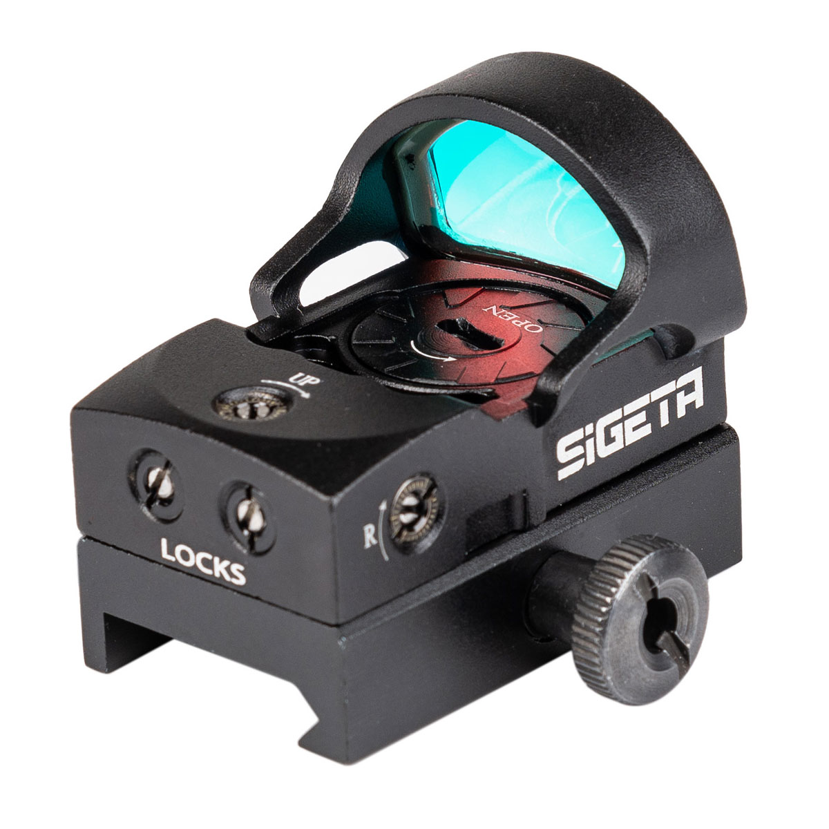 Коліматорний приціл SIGETA AntiRU-05 має один вид прицільної сітки з червоною підсвіткою. Проєкціює на лінзу прицільну точку RedDOT розміром 4 MOA. Вибір інтенсивності червоного кольору (7 рівнів) виконується натисканням кнопок на бічній частині корпусу. Кнопка регулювання яскравості з гумовою поверхнею, що дозволить вам змінювати налаштування, не знімаючи рукавичок.