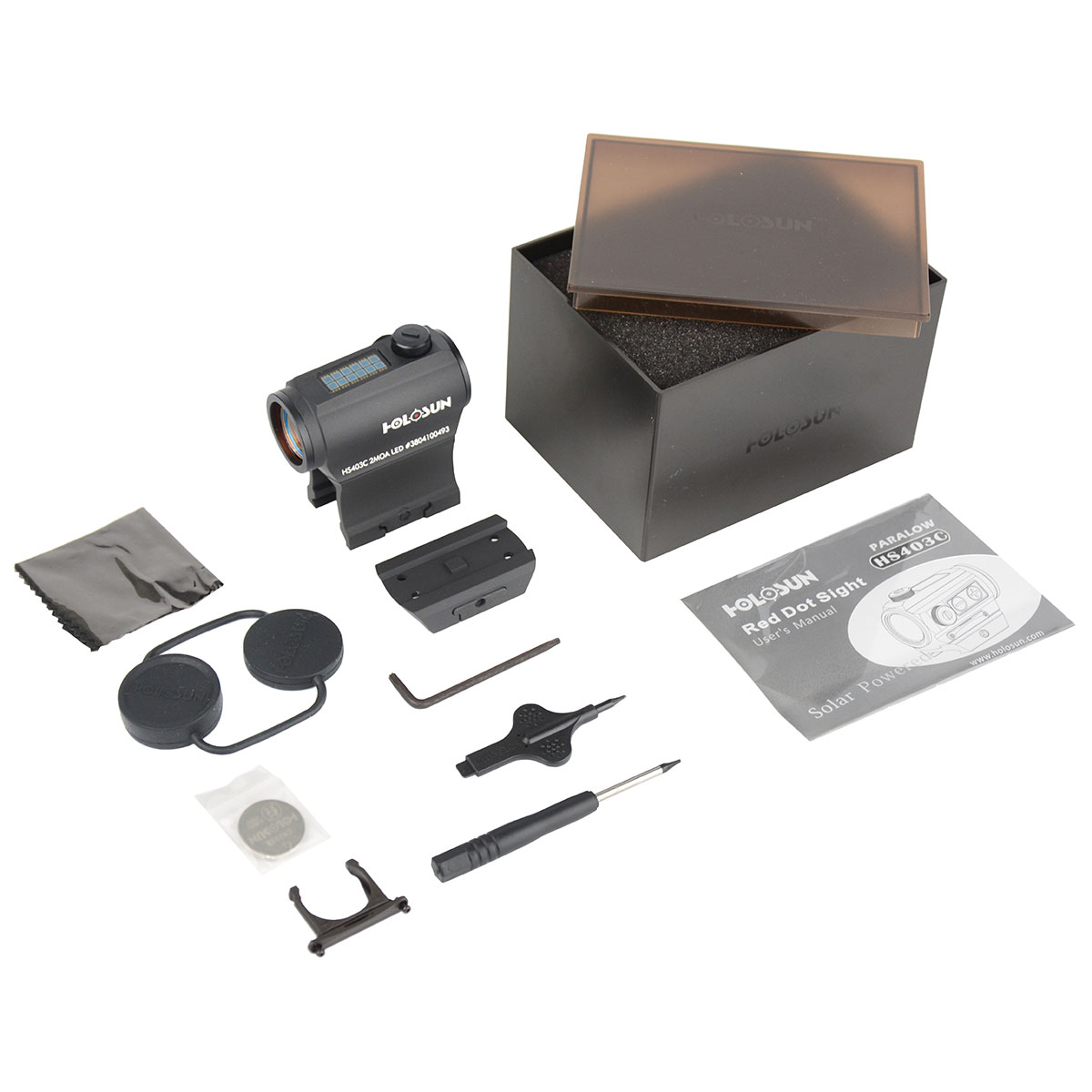 Holosun HS403C — технологічний коліматорний приціл на сонячних панелях в герметичному корпусі з алюмінієвого сплаву 6061. Прицільна точка червоного кольору має розмір 2 МОА. Особливістю даної моделі є комбіноване живлення від сонячної панелі або батарейки, а також електронне кнопкове управління яскравістю підсвітки з 12 рівнів (перші 2 рівні розраховані на роботу вночі або з ПНБ). Система освітлення побудована на фірмовому світлодіоді, енергоефективність якого дозволяє працювати протягом 50 000 годин на одному заряді батареї (CR2032). Корпус прицілу має захист за стандартом IP67, а внутрішній простір заповнений інертним газом для запобігання запотіванню. Стійкість до віддачі підтверджена тестами на ударостійкість з навантаженням до 1000 G. Коліматор постачається в комплекті з високим та низьким кріпленням на планку Weaver/Picatinny, що дозволить встановити його на більшість видів зброї.