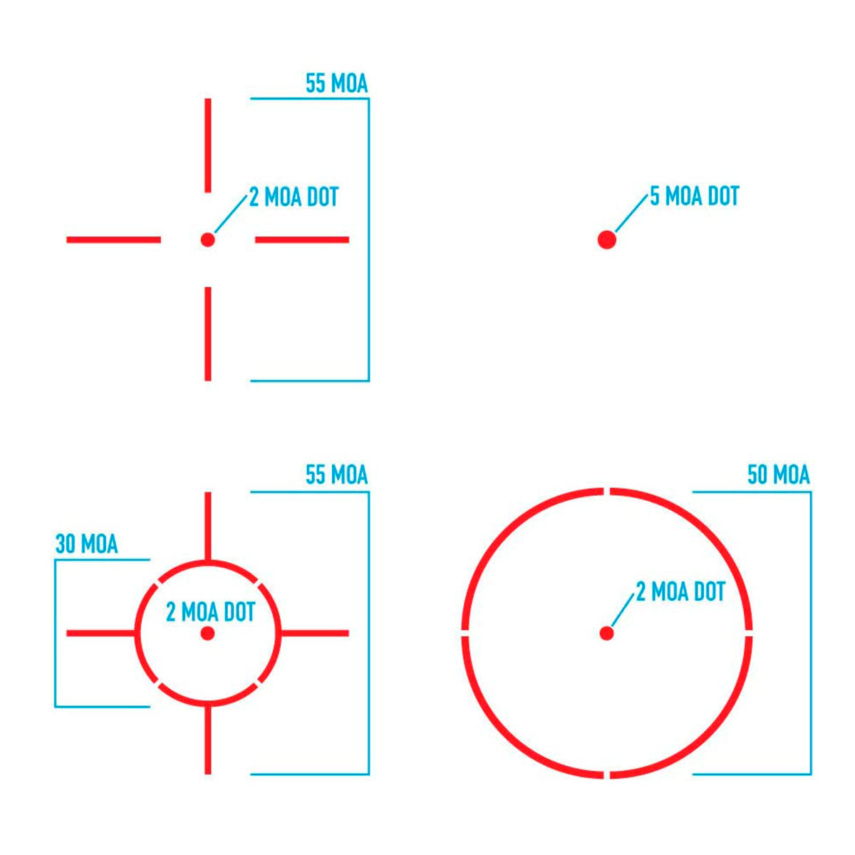 - Тип прицільної сітки: точка 5 MOA, точка 3 MOA з колом 50 MOA, точка 3 MOA з перехрестям 50 MOA, точка 3 MOA з колом та перехрестям 30 MOA