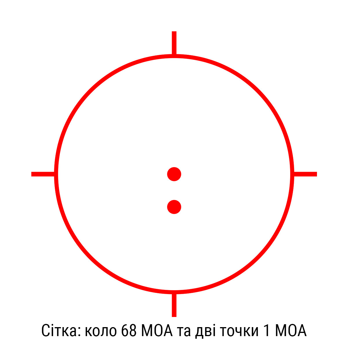 - Сітка прицілу: дві точки 1 MOA та коло 68 MOA