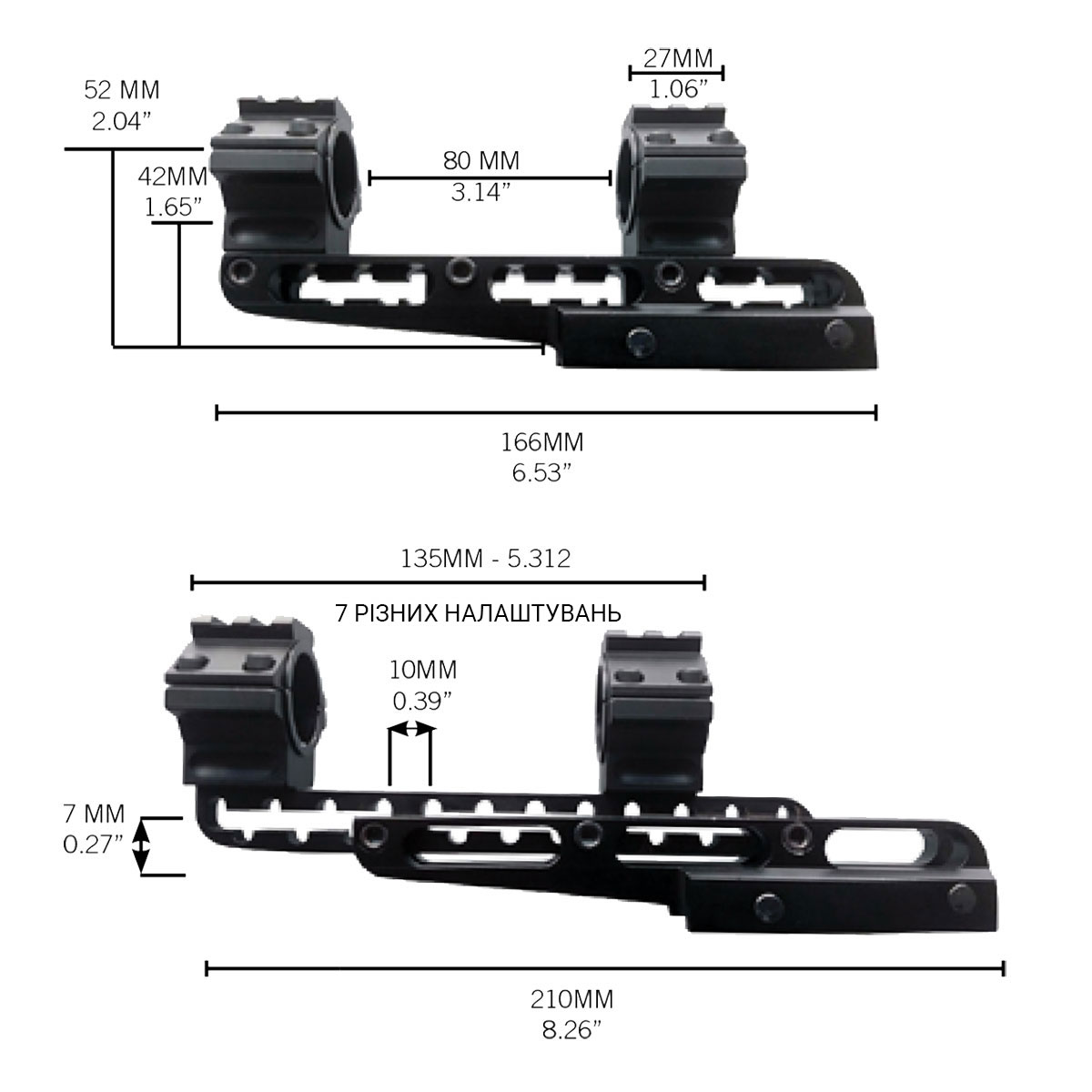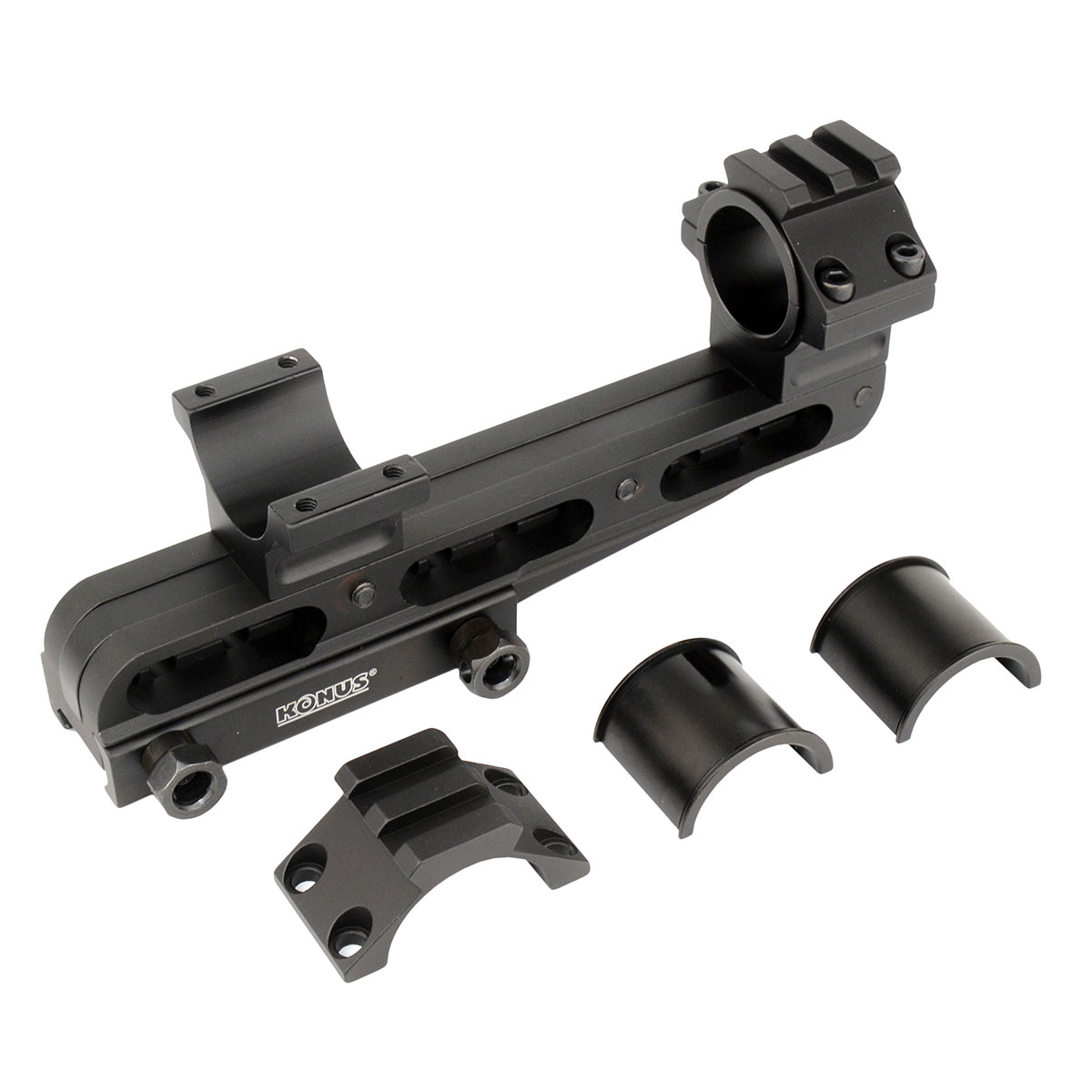KONUS Cantilever Mount (#7219) — універсальне кріплення для оптичних прицілів Konus, яке встановлюється на планку Вівер/Пікатінні. Це найбільш передова система кронштейнів під мисливську оптику, що пропонує повну свободу та універсальність. Кріплення розраховане на діаметр трубки прицілів 25.4 мм та 30 мм. У комплекті йдуть спеціальні вкладки для дюймових моделей. Конструкція допускає регулювання як по довжині, так і по висоті. Виробник також передбачив інтегровану планку Вівер/Пікатінні для встановлення додаткових аксесуарів на верхній частині кріплення.