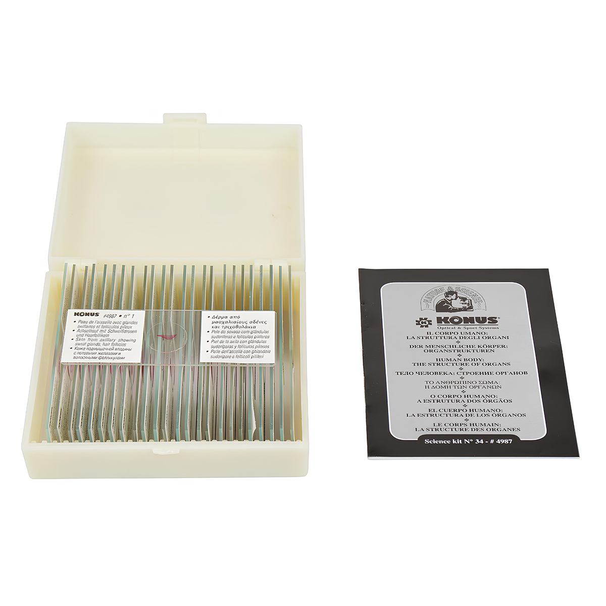 За допомогою цього набору можна вивчити будову всіх видів тканин здорового людського організму – епітеліальної, м'язової, нервової та сполучної. Слайди виготовлені із високоякісних матеріалів та мають індивідуальні описи відповідного зразка 8 мовами. До того ж, набір включає опис всіх комплектів мікропрепаратів від компанії Konus, що охоплюють багато різних тем.