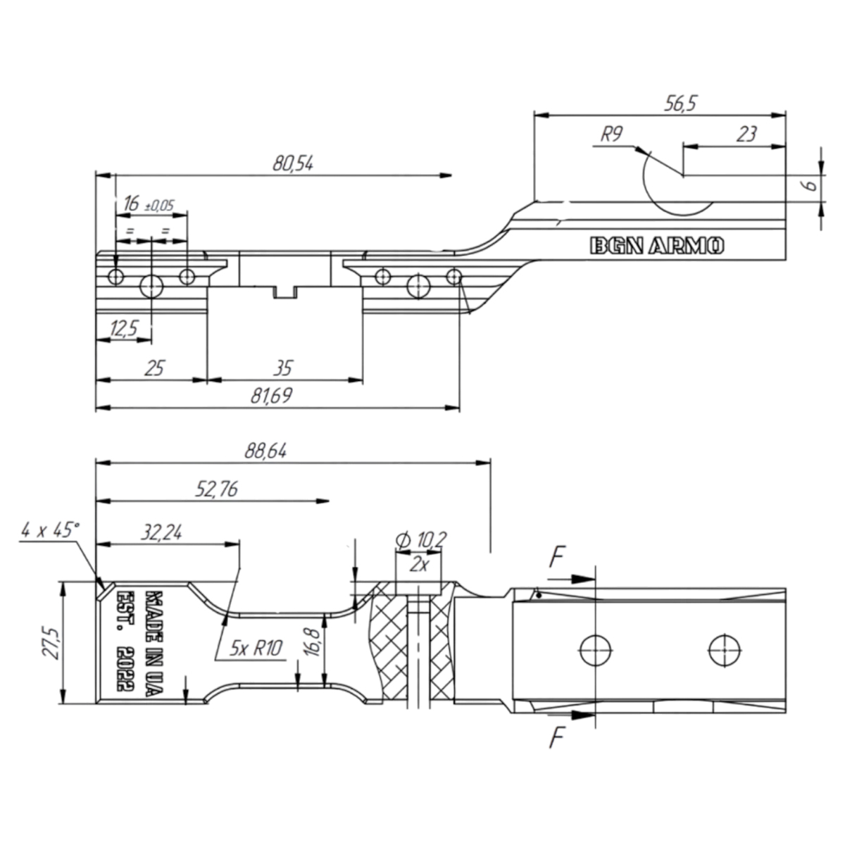 Корпус кріплення виготовлений з високоякісного авіаційного алюмінію, що забезпечує баланс між міцністю конструкції та мінімальною вагою, аби не порушувати баланс зброї. Для максимальної довговічності та захисту від корозії, подряпин та агресивних хімічних впливів (порохових газів, збройових мастил), вся поверхня пройшла процес твердого анодування. Матове чорне покриття виключає появу сонячних відблисків, це є важливим для маскування. Ключовий силовий елемент – притискна планка – виготовлена із загартованої легованої сталі (марки 40X або її європейського аналога 42Cr4), це гарантує виняткову стійкість до деформації та потужних ударних навантажень при віддачі.