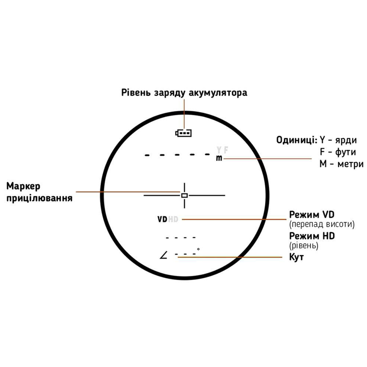- режим HD (Horizontal Distance): режим вимірювання горизонтальної дистанції до цілі (проєкція реальної дистанції на горизонтальну поверхню). На дисплеї відображається пряма відстань, горизонтальна відстань та кут.