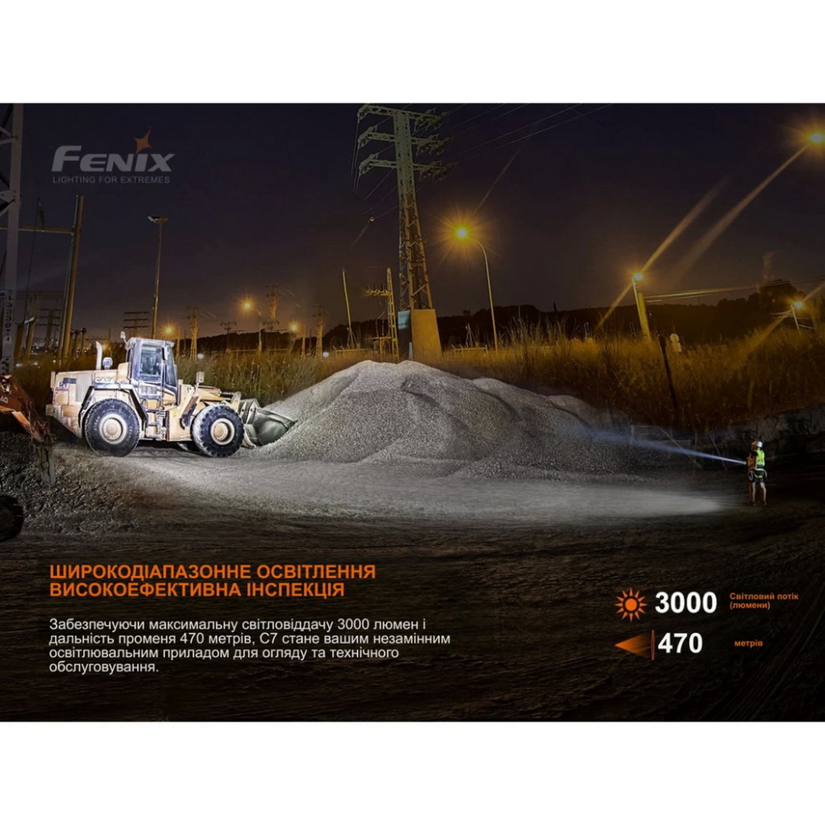 Fenix C7 — це потужний ручний ліхтар нового покоління, створений як надійний інструмент для інженерних робіт, технічного обслуговування, рятувальних завдань та активного відпочинку. В його основі працює сучасний світлодіод Luminus SST70, який генерує яскравий потік світла у 3000 люменів. Завдяки продуманій оптичній системі дальність освітлення сягає 470 метрів, що дозволяє без зусиль підсвічувати віддалені об’єкти та забезпечує відмінну видимість навіть у важких погодних умовах.