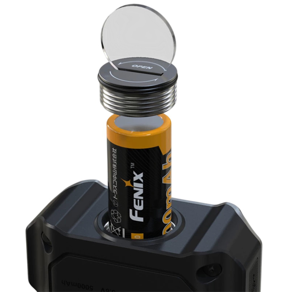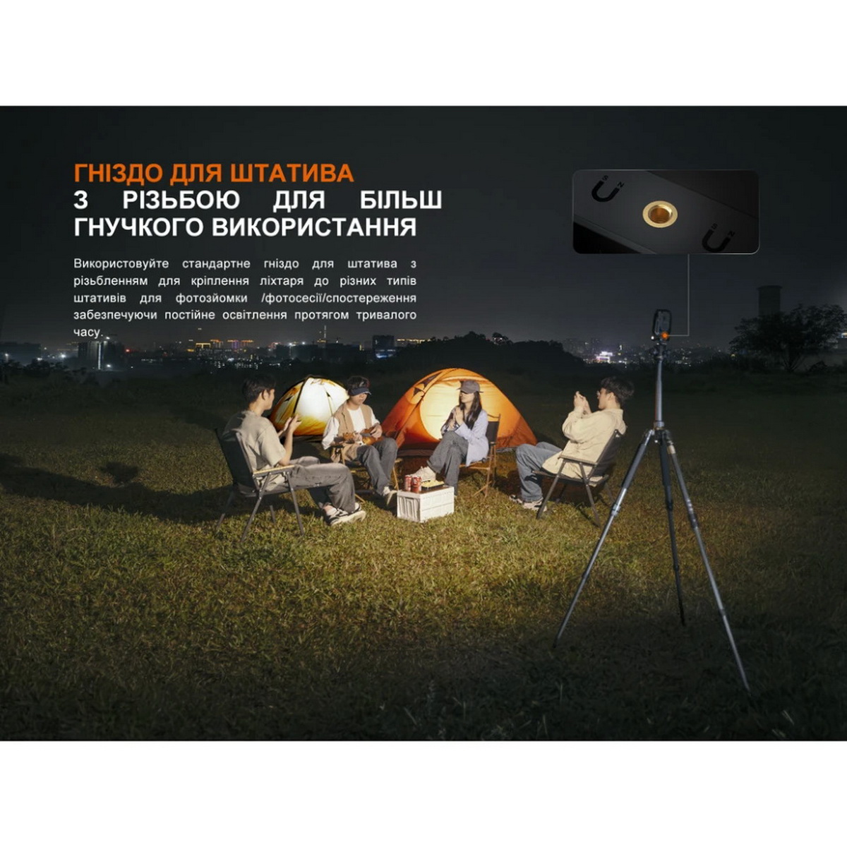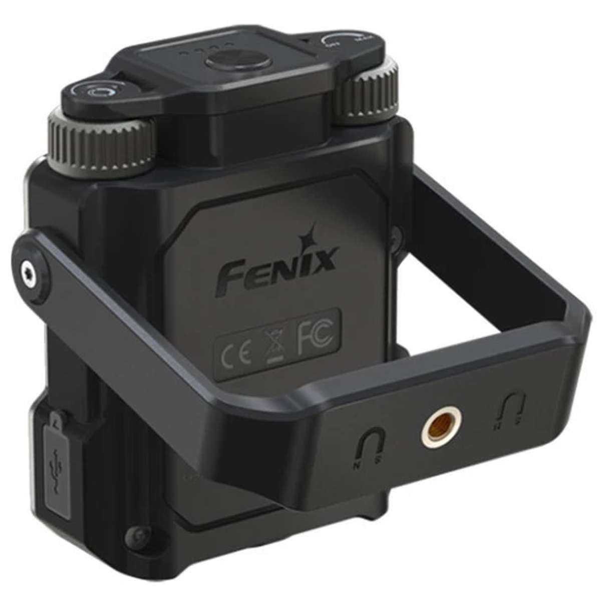 За живлення пристрою відповідає фірмовий високоємний акумулятор Fenix ARB-L21-5000 V2.0 формату 21700, який забезпечує тривалий час роботи — до 285 годин. Зарядка акумулятора здійснюється через сучасний порт USB Type-C, дозволяючи швидко поповнити енергію від будь-якого сумісного джерела (павербанк, ноутбук, мережевий адаптер). Для максимальної універсальності кріплення ліхтар оснащений стандартним різьбовим отвором для встановлення на штатив, що є незамінним для фотографів та відеографів. Крім того, унікальна ручка-тримач має вбудований потужний магніт та здатна обертатися на 360°, дозволяючи надійно зафіксувати ліхтар на будь-якій металевій поверхні під потрібним кутом.