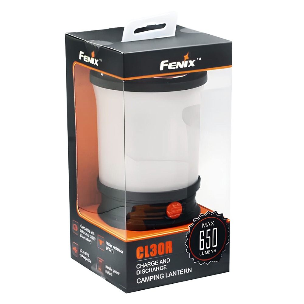 USBFenix CL30R Black (650 Лм) – сучасний яскравий кемпінговий ліхтар, виконаний у формі, що нагадує старовинний ліхтар. Практично весь корпус приладу слугує розсіювальною лінзою, завдяки чому світло рівномірно розходиться у всіх напрямках на відстань до 35 метрів. Ця модель ідеально підходить туристам, рибалкам, мисливцям, а також стане в нагоді під час відпочинку на природі з ночівлею.
