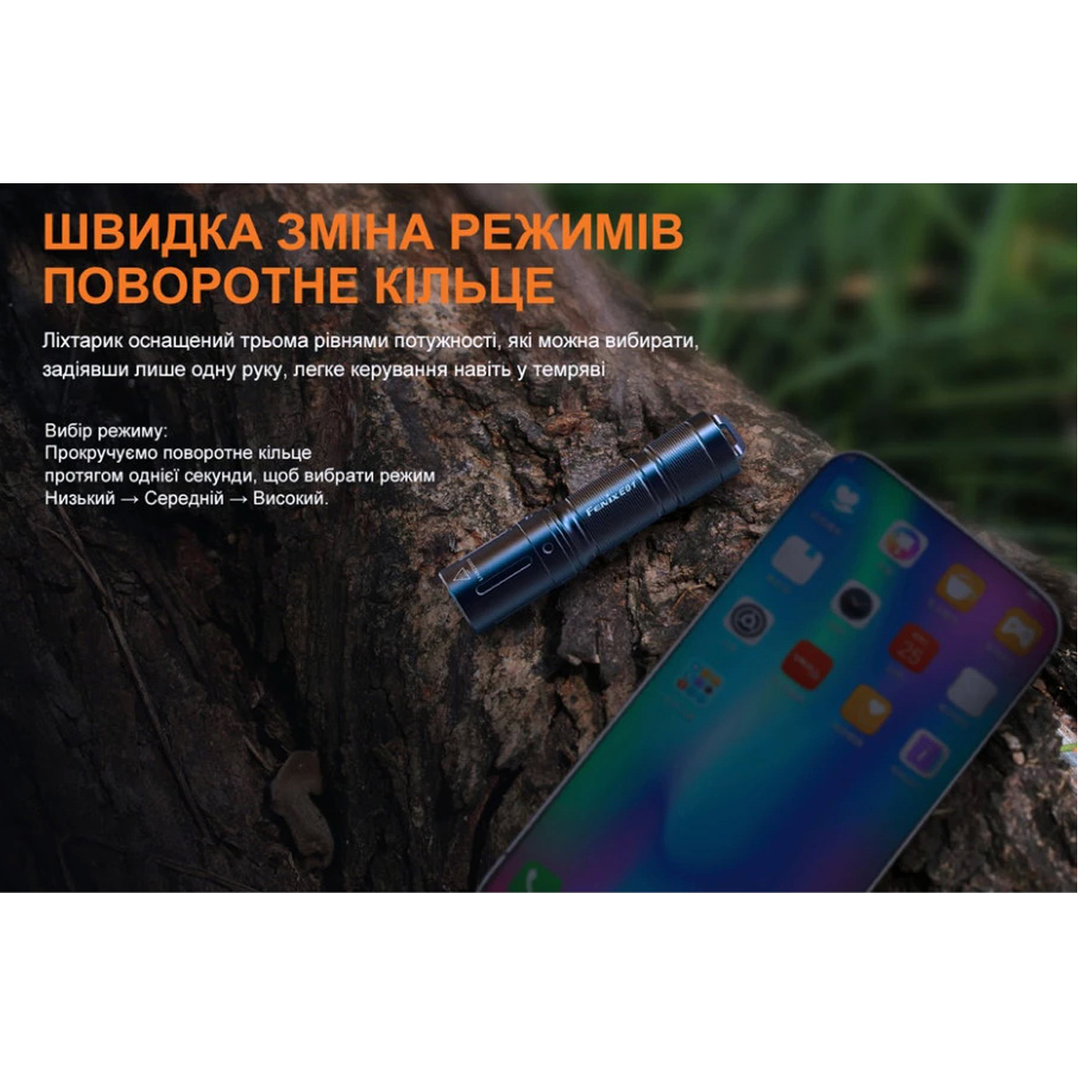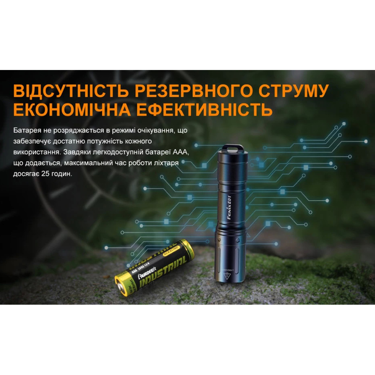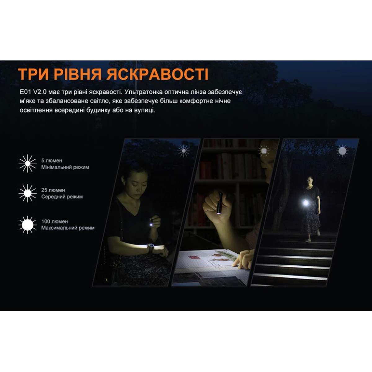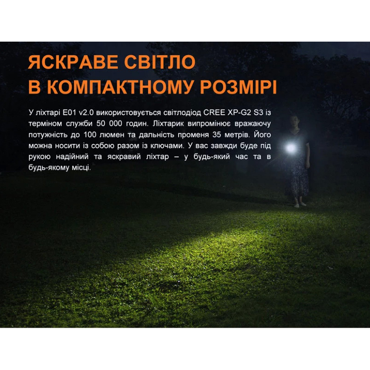 Ліхтар Fenix E01 V2.0 — це компактний і надійний освітлювальний інструмент, створений для щоденного використання, подорожей, кемпінгу, а також як допоміжне джерело світла у будь-яких непередбачуваних ситуаціях. Попри мініатюрні розміри, він здатний видати потужний світловий потік у 100 люменів, чого достатньо для впевненого освітлення робочого простору чи невеликих ділянок місцевості. Дальність дії світлового променя сягає 35 метрів, що робить його корисним не лише в побуті, але й під час прогулянок у темний час доби. Максимальна тривалість світіння до 25 годин дозволяє користуватися ліхтарем протягом усього дня без необхідності заміни елементів живлення, це особливо важливо у поїздках чи під час відпочинку на природі.