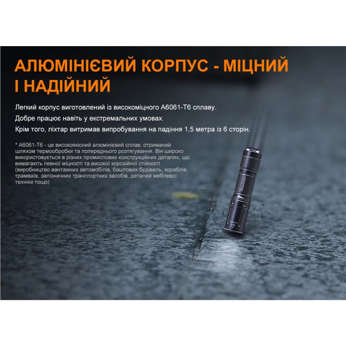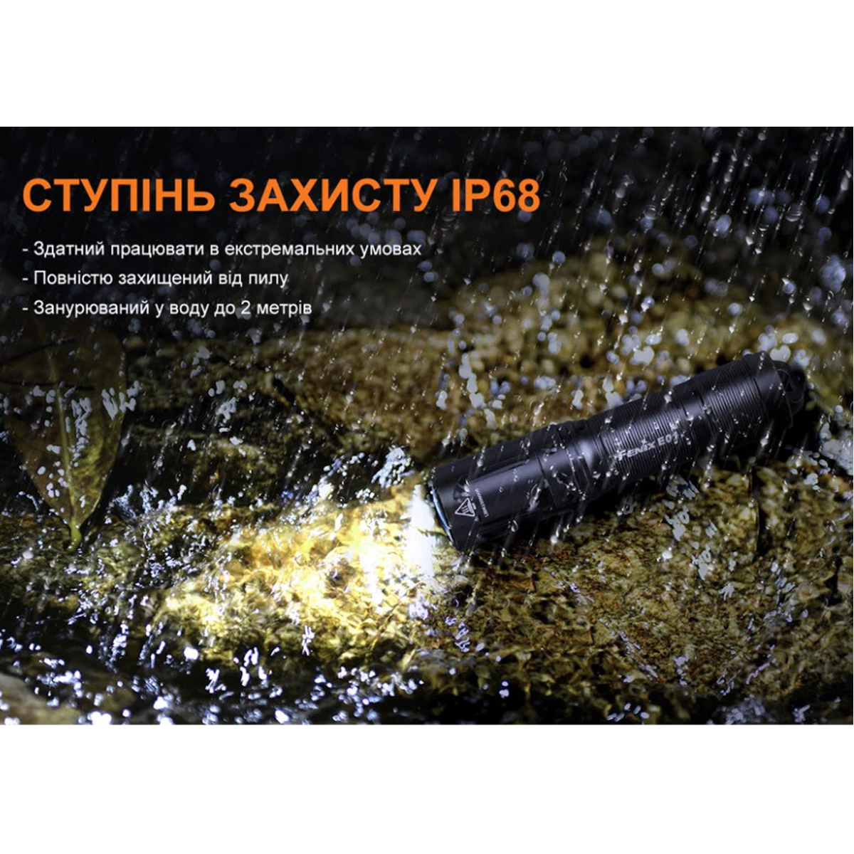 Корпус ліхтаря виготовлений із високоякісного алюмінієвого сплаву, який має анодування III ступеня, що забезпечує додаткову стійкість до зношування, подряпин і впливу зовнішніх факторів. Завдяки цьому ліхтар зберігає привабливий вигляд навіть після тривалого використання. Керування здійснюється за допомогою поворотного кільця, яке робить процес перемикання режимів простим і інтуїтивно зрозумілим. Для додаткової надійності модель має ударостійкість до 1 метра, а також повну водонепроникність стандарту IP68, дозволяючи використовувати її під час дощу, снігопаду чи навіть при короткочасному зануренні у воду.