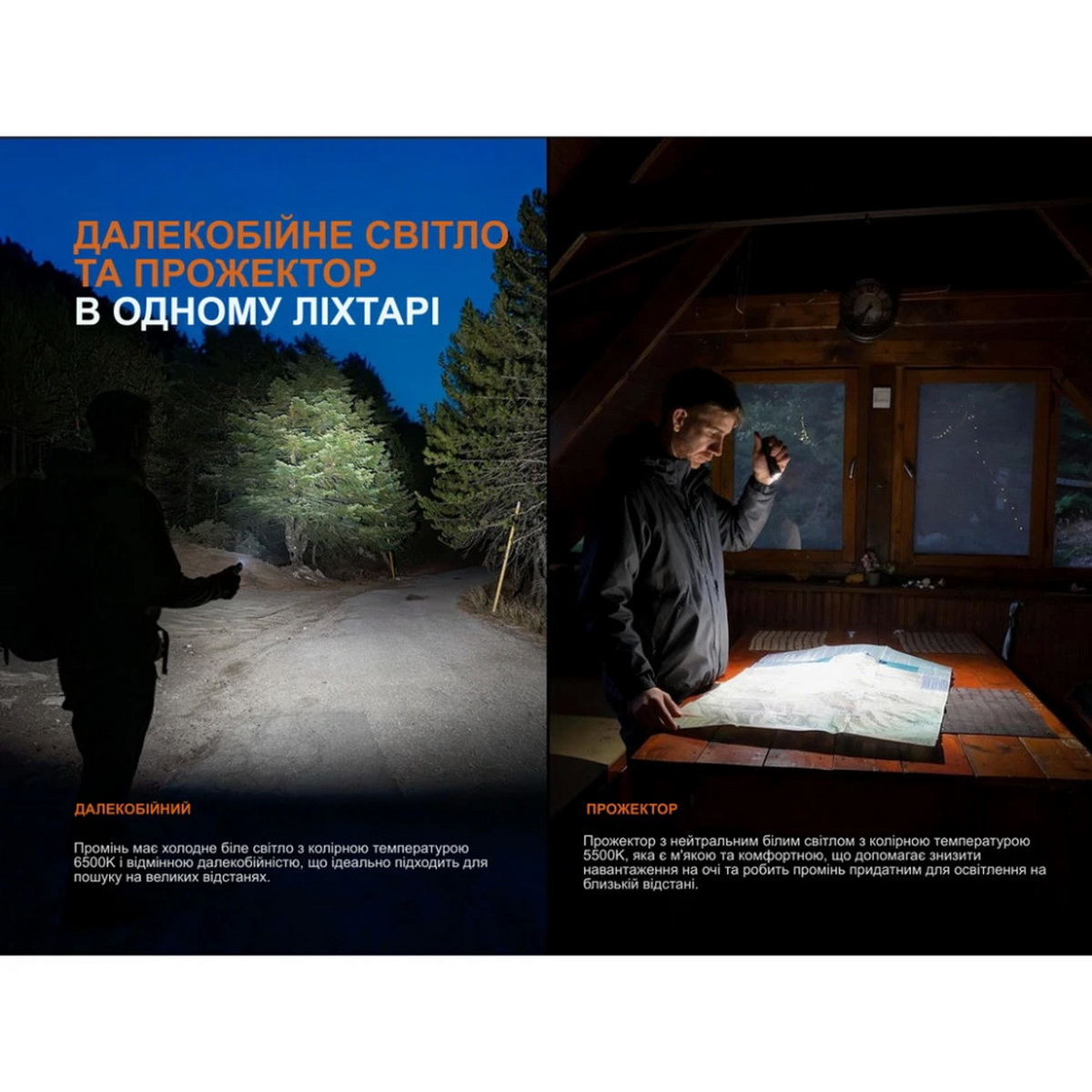 Світловий потік досягає 1600 люменів, а максимальна дальність променя становить 160 метрів. У конструкції використані світлодіоди Luminus SST20 та Luminus SFT25, які формують два типи білого світла: 6500K — для сфокусованого далекобійного променя та 5500K — для широкого рівномірного освітлення в режимі прожектора. Додаткові можливості розширює ультрафіолетовий діод 365 нм, що стане у пригоді для перевірки документів або виявлення прихованих міток, а також червоний лазер 650 нм для точного наведення чи позначення.