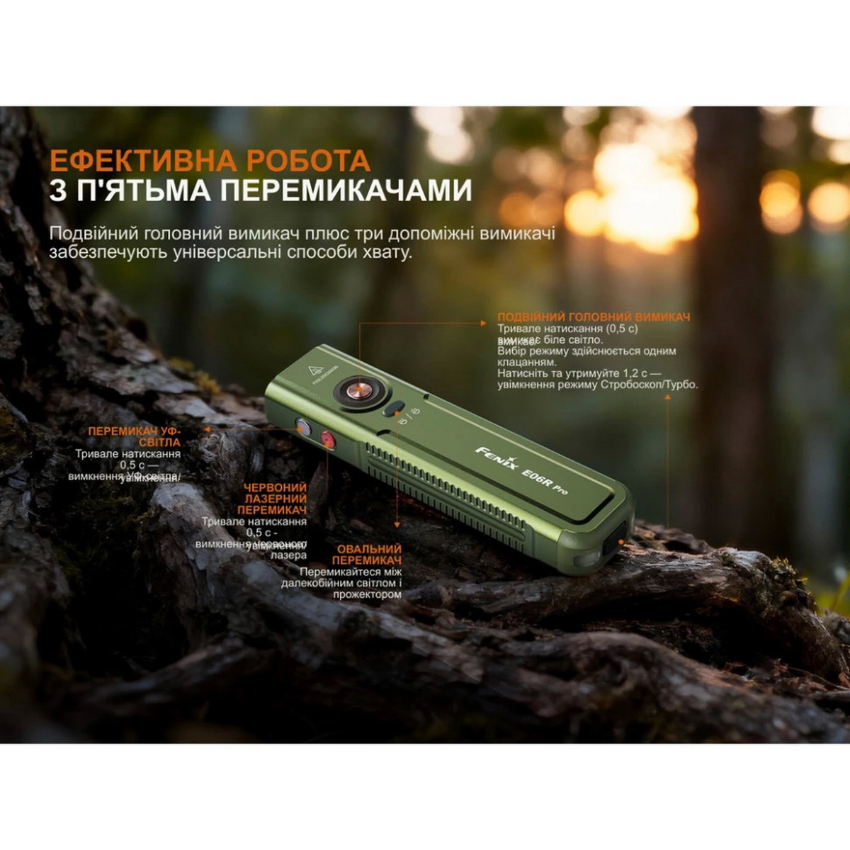 Fenix E06R PRO — це універсальний компактний ліхтар із потужним світловим потоком, широким набором режимів і додатковими функціями у вигляді УФ-підсвітки та лазера. Він стане практичним вибором для тих, хто шукає надійний інструмент на кожен день із розширеними можливостями в мінімальному форматі.